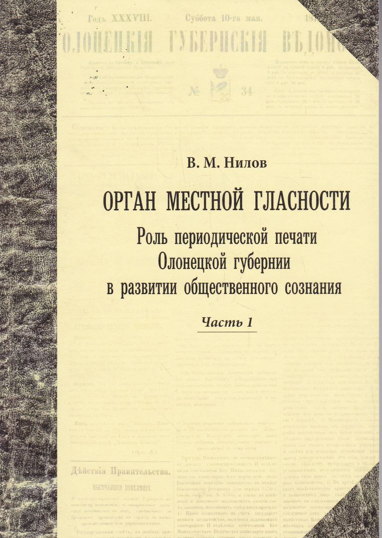 Орган местной гласности : роль периодической печати Олонецкой губернии в развитии общественного сознания : [монография : в 2 частях] / В. М. Нилов ; Министерство образования и науки Российской Федерации, Федеральное государственное бюджетное образовательное учреждение высшего образования Петрозаводский государственный университет. - Петрозаводск : Издательство ПетрГУ, 2017. - 20 см. - ISBN 978-5-8021-3097-1