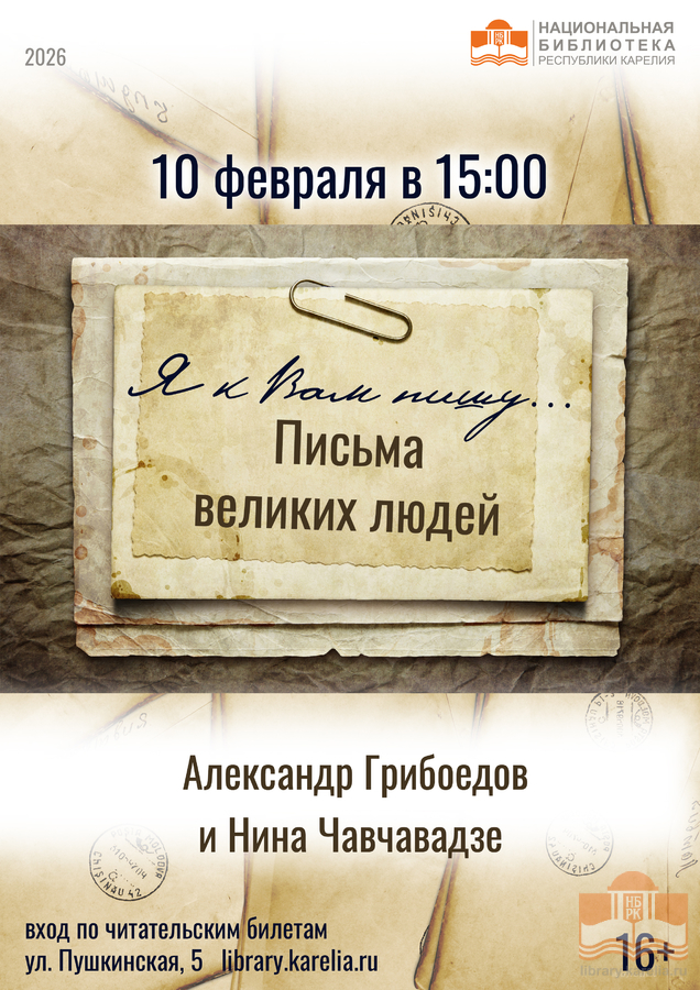 10 февраля в 15:00 в Национальной библиотеке Карелии состоится новая встреча в рамках цикла просветительских программ «Я к Вам пишу..Письма великих людей», посвященная истории любви русского писателя Александра Сергеевича Грибоедова и грузинской княжны Нины Чавчавадзе.