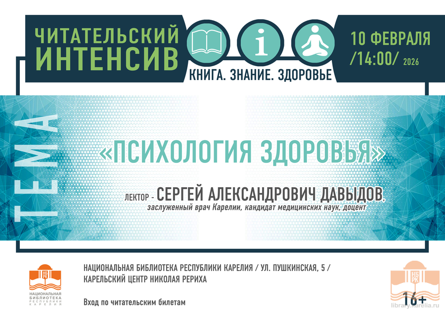 10 февраля в 14:00 в Национальной библиотеке Карелии начнёт работу читательский интенсив «Книга. Знание. Здоровье». Лекцию «Психология здоровья» прочтет заслуженный врач Карелии Сергей Александрович Давыдов.