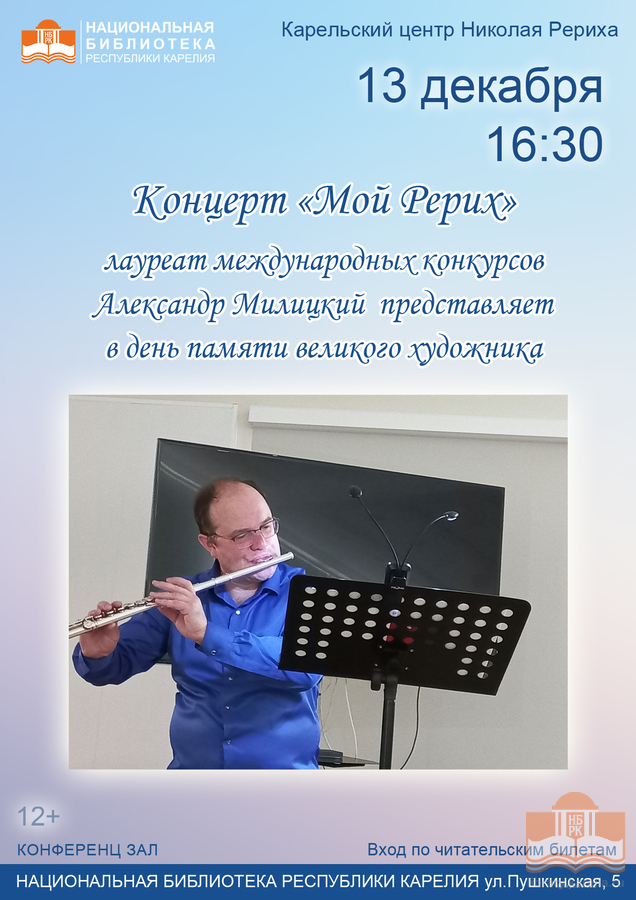 13 декабря 1947 года Николай Константинович Рерих, находясь в Индии, ушёл в мир иной. Светлой памяти этого великого русского художника 13 декабря в 16:30 посвящает своё выступление известный музыкант, лауреат международных конкурсов, друг Национальной библиотеки Александр Милицкий.