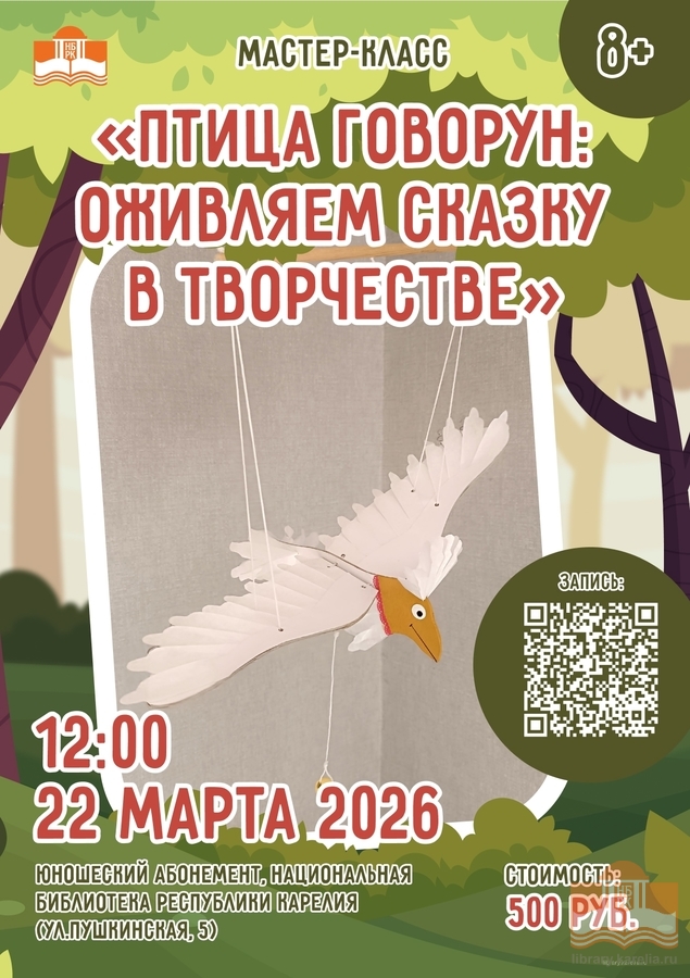 22 марта в 12:00 Национальная библиотека Карелии приглашает юных фантазёров на творческий мастер-класс, где каждый создаст собственный интерьерный мобиль в виде легендарной птицы Говоруна из мультфильма «Тайна третьей планеты» по мотивам произведений Кира Булычёва.
