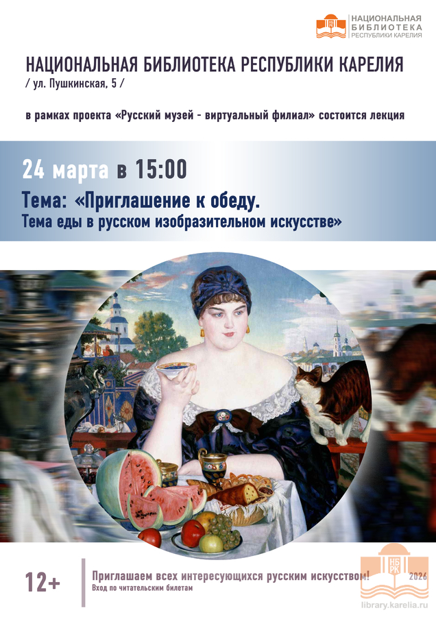 24 марта в 15:00 Национальная библиотека Карелии и проект «Русский музей: виртуальный филиал» приглашают читателей на встречу, посвящённую гастрономической теме в русском изобразительном искусстве.