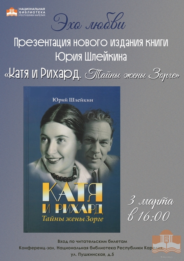 3 марта в 16:00 Национальная библиотека Карелии приглашает на презентацию нового издания книги Юрия Шлейкина «Катя и Рихард. Тайны жены Зорге».