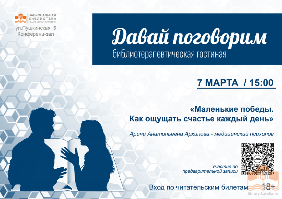 7 марта в 15:00 в Библиотерапевтической гостиной Национальной библиотеки Карелии состоится лекция-тренинг «Маленькие победы. Как ощущать счастье каждый день».