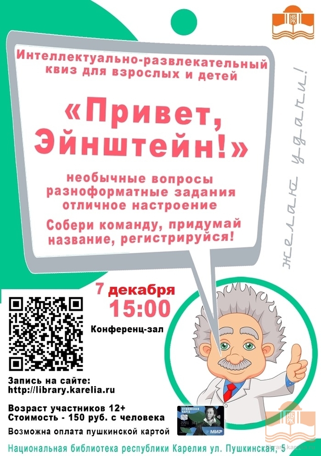 7 декабря в 15:00 Национальная библиотека Карелии приглашает всех желающих на «интеллектуальную битву». Семейный интеллектуальный квиз «Привет, Эйнштейн», давно пользуется популярностью у читателей Национальной библиотеки.