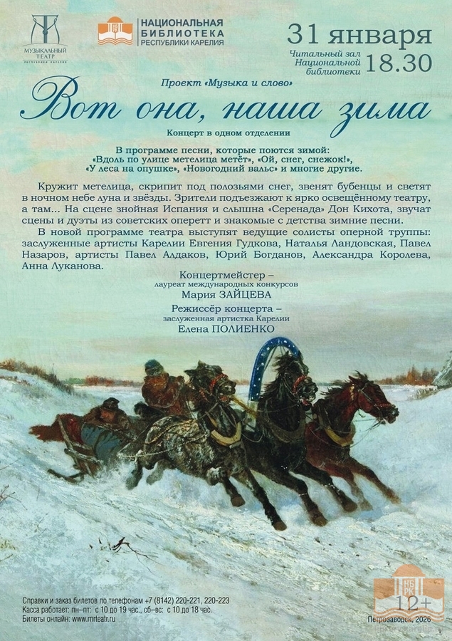 31 января в 18:30 в Национальной библиотеке Карелии в рамках совместного проекта «Музыка и слово» Музыкальный театр Карелии представит новую концертную программу «Вот она, наша зима!».