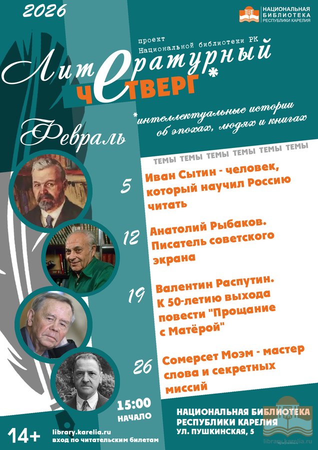 5 февраля в 15:00 в Национальной библиотеке Карелии пройдет новая встреча в рамках проекта «Литературный четверг», которая будет посвящена жизни Ивана Сытина. В 2026 году исполняется 175 лет содня рождения издателя.