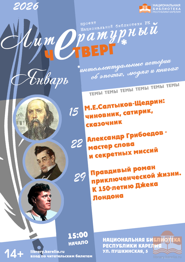 6 января в 14:00 Национальная библиотека Карелии приглашает на краеведческую прогулку по «Литературному Петрозаводску». На протяжении трех веков в нашем городе жили и творили литераторы российского масштаба: П. Н. Рыбников, Ф. Н. Глинка, Г. Р. Державин, К. Г. Паустовский, Р. И. Рождественский.