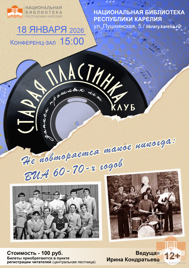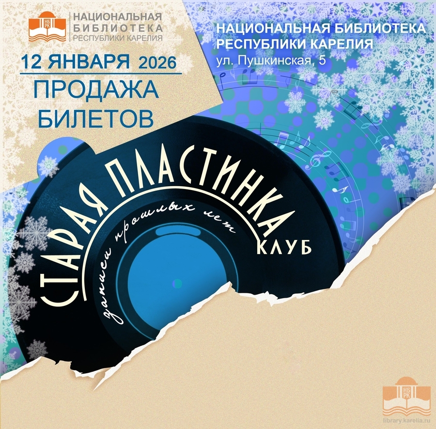 Уважаемые читатели! Информируем вас о том, что продажа билетов на программу клуба «Старая пластинка» 18 января 2026 года будет открыта с 12 января 2026 года.