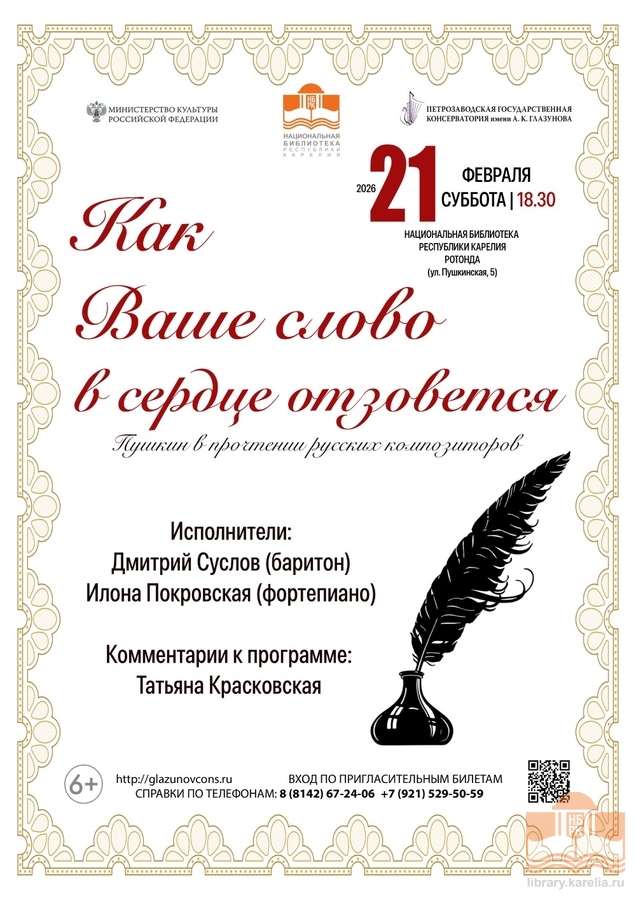 21 февраля в 18:30 в ротонде Национальной библиотеки Карелии состоится концерт вокальной музыки «Как ваше слово в сердце отзовется».