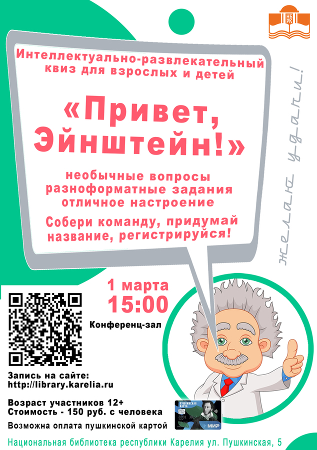 1 марта в 15:00 Национальная библиотека Карелии приглашает всех желающих на «интеллектуальную битву». Семейный интеллектуальный квиз «Привет, Эйнштейн» давно пользуется популярностью у читателей Национальной библиотеки.Первая игра прошла в 2019 году. В квизе могут принять участие все желающие. Участники в игровом формате будут сражаться за звание самой эрудированной команды, ответив на вопросы из разных областей знаний, в том числе, по краеведению. Участие в квизе – это возможность не только проверить свою эрудицию, но и отлично провести время, пережить живые и яркие эмоции в интеллектуальной борьбе и поймать отличное настроение!