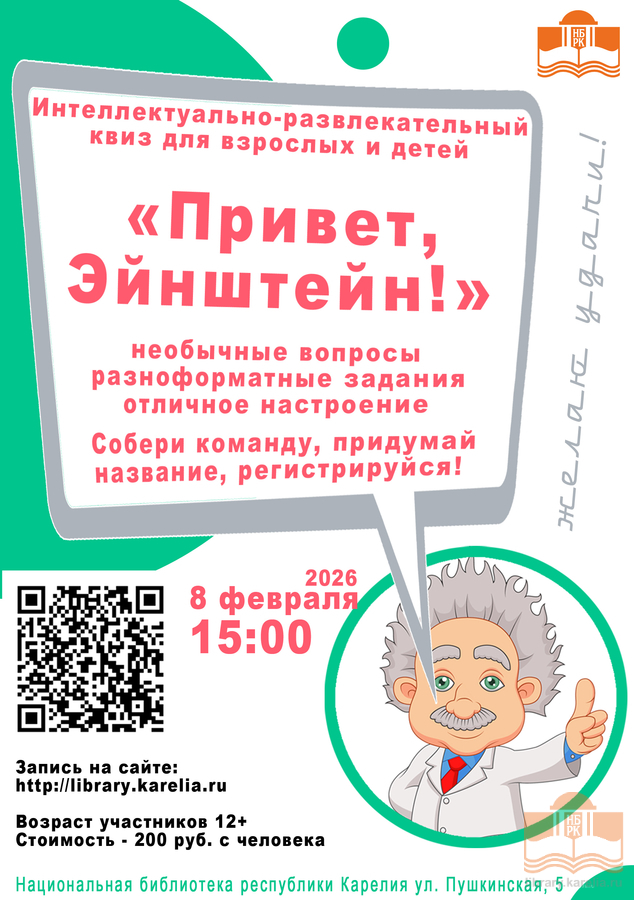 8 февраля в 15:00 Национальная библиотека Карелии приглашает всех желающих на «интеллектуальную битву». Семейный интеллектуальный квиз «Привет, Эйнштейн», давно пользуется популярностью у читателей Национальной библиотеки.Первая игра прошла в 2019 году. В квизе могут принять участие все желающие. Участники в игровом формате будут сражаться за звание самой эрудированной команды, ответив на вопросы из разных областей знаний, в том числе, по краеведению. Участие в квизе – это возможность не только проверить свою эрудицию, но и отлично провести время, пережить живые и яркие эмоции в интеллектуальной борьбе и поймать отличное настроение.