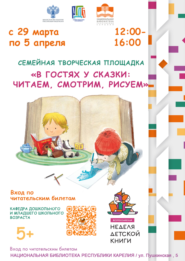 12:00 – 16:00 – Семейная творческая площадка «В гостях у сказки: читаем, смотрим, рисуем», 5+