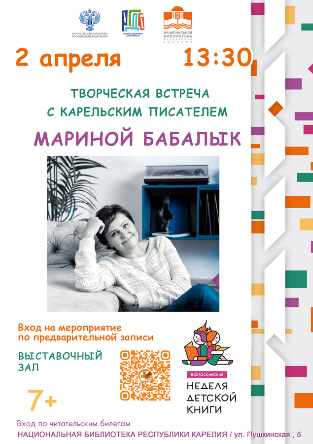 13:30 – Творческая встреча с карельским писателем Мариной Бабалык, 7+