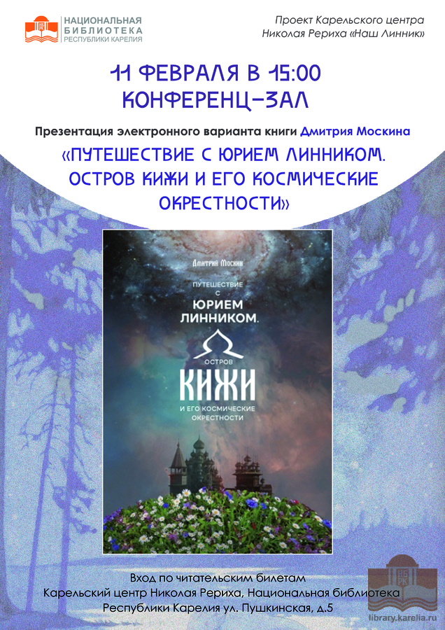 11 февраля в 15:00 Национальная библиотека Карелии и проект Карельского центра Николая Рериха «Наш Линник» приглашают на презентацию электронного варианта книги дизайнера, художника, журналиста, Заслуженного работника культуры Карелии Дмитрия Москина «Путешествие с Юрием Линником. Остров Кижи и его космические окрестности».Книга знакомит читателей с творчеством Юрия Линника, поэта, писателя-натуралиста, философа, учёного и коллекционера (1944 - 2018). Стихи, отрывки из различных произведений, статьи, картины из его коллекции, многочисленные эссе, талантливо и остроумно проиллюстрированные Дмитрием Москиным, увидят участники встречи. Их воображение поразит широта творческих интересов, глубина знаний в разных областях духовной человеческой деятельности нашего знаменитого земляка.