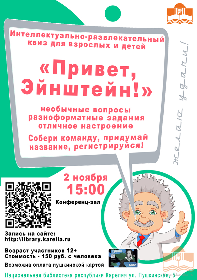 2 ноября в 15:00 Национальная библиотека Карелии приглашает всех желающих на «интеллектуальную битву». Семейный интеллектуальный квиз «Привет, Эйнштейн», давно пользуется популярностью у читателей Национальной библиотеки.