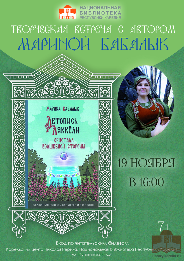 19 ноября в 16:00 Национальная библиотека Республики Карелия приглашает любителей вымышленных миров на творческую встречу с Мариной Бабалык, автором художественной книги в жанре этнического фэнтези «Летопись Ляккёли. Кристалл Волшебной стороны». Событие состоится в Карельском центре Николая Рериха Национальной библиотеки.