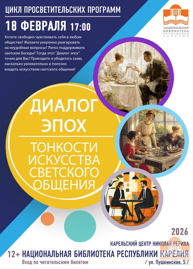 18 февраля в 17:00 Национальная библиотека Карелии приглашает на новую встречу цикла просветительских программ «Диалог эпох». Тема встречи - тонкости искусства светского общения.Гостем проекта станет Ольга Михалёва – сертифицированный тренер по этикету, член Национальной ассоциации экспертов по деловой этике, этикету и протоколу (НАДЭП).