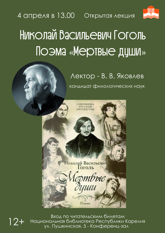 4 апреля в 13:00 в Национальной библиотеке Карелии состоится открытая лекция кандидата филологических наук Вячеслава Васильевича Яковлева, посвященная поэме Н. В. Гоголя «Мертвые души». Лекция приурочена к 1 апреля – дню рождения писателя. В 2026 году Гоголю исполняется 217 лет.