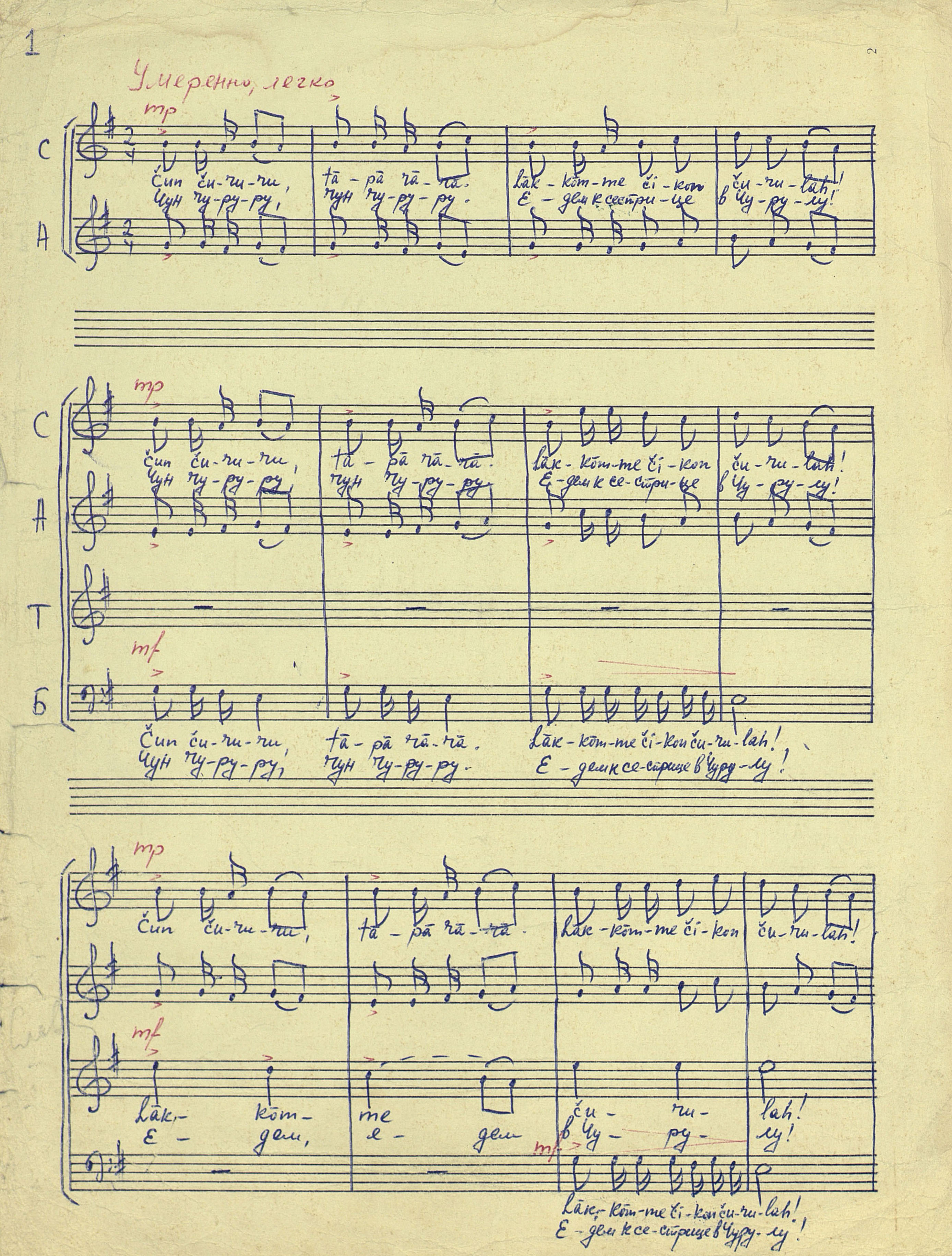 Чун-чуруру [Ноты : рукопись] : (карельская народная песня) : [для смешанного хора : без сопровождения] / обраб. Б. Константиновского. - [после 195-]. - 2 л. (3 с.) ; 31 см, в картонной папке. - На карел. и рус. яз. - Коллекция нотных рукописей карельских композиторов и музыкантов. Опись № 1, дело № 1228