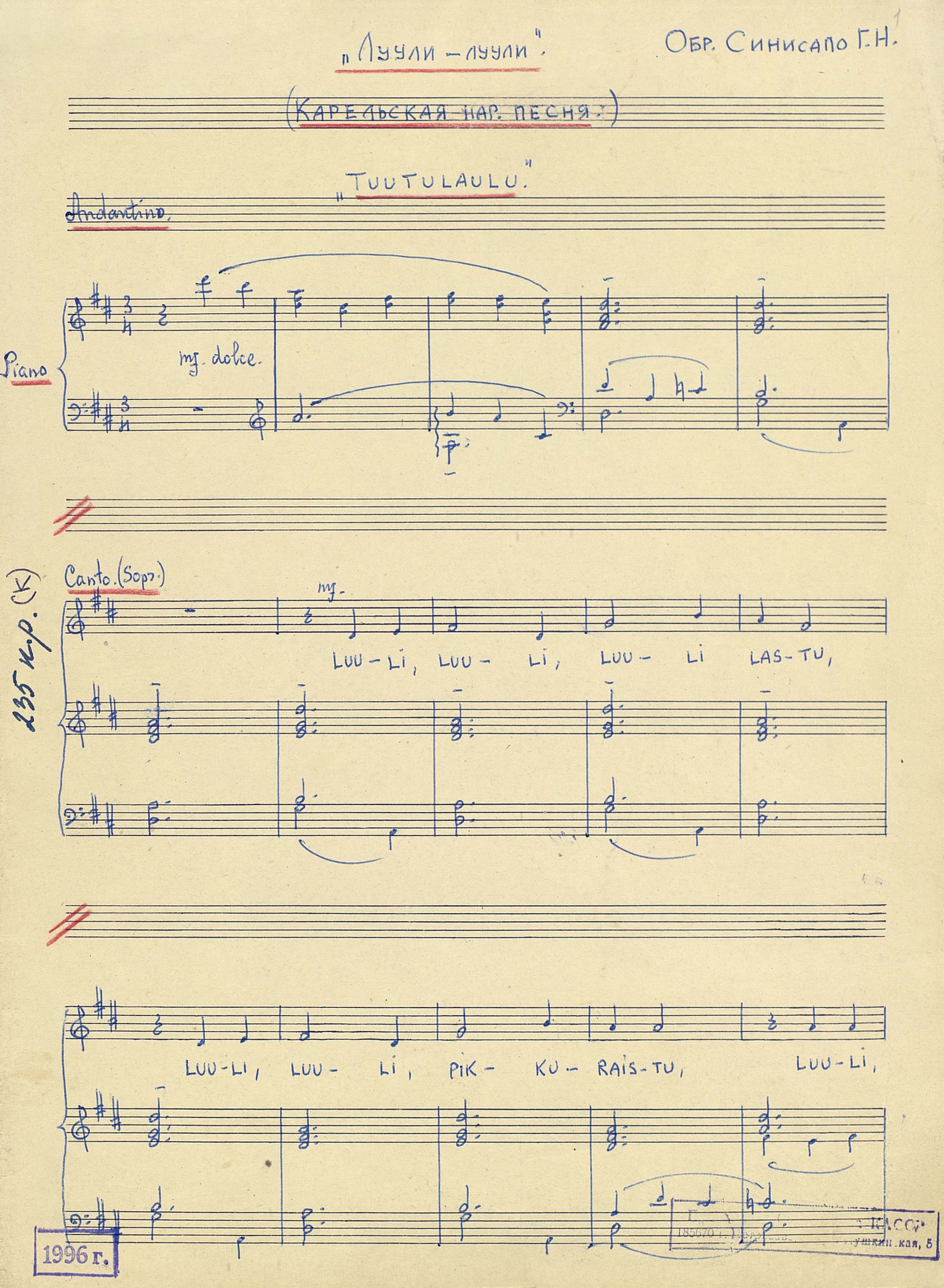 Луули-луули [Ноты : рукопись] : (карельская народная песня) : [для голоса и фортепиано] / обраб. Синисало Г. Н. - [до 1989]. - 2 л. (4 с.) ; 30 см ; в картонной папке. - Коллекция нотных рукописей карельских композиторов и музыкантов. Опись № 1, дело № 222