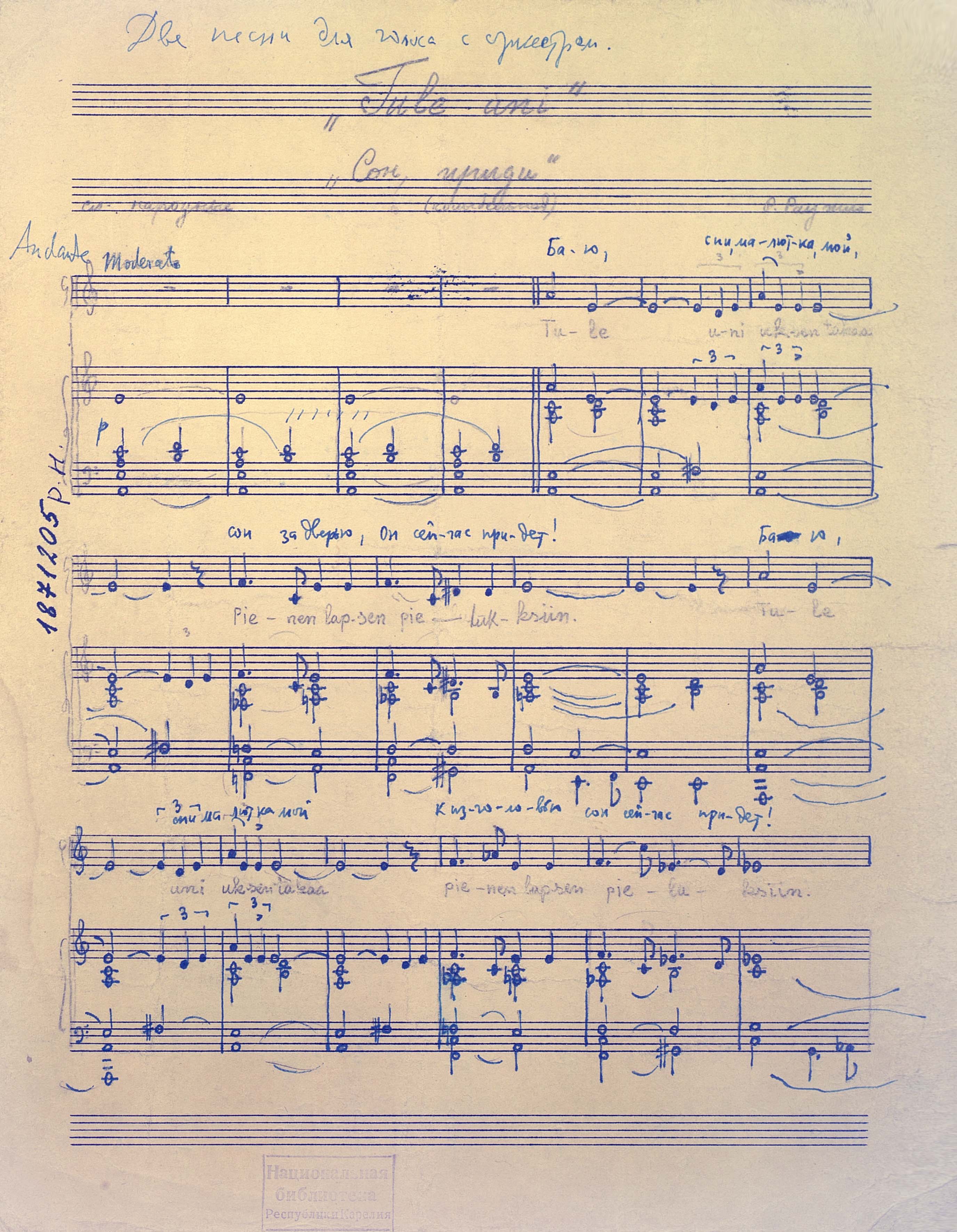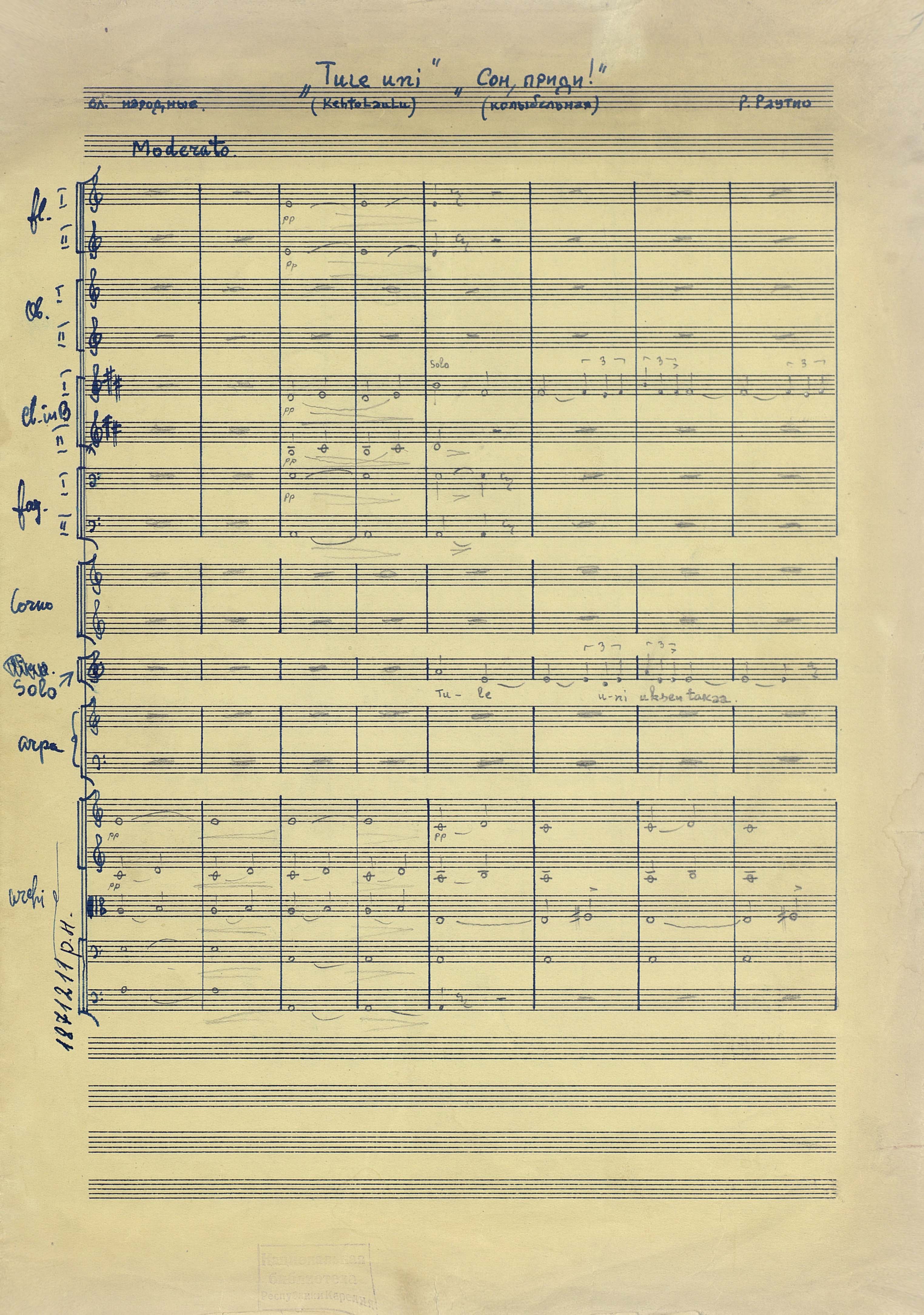 "Tule uni..." [Ноты : рукопись] : (колыбельная) : [для голоса и ансамбля (оркестра)] / Р. Раутио ; сл. народные. - Партитура. - [до 1960]. - 3 л. (6 с.) ; 37 см, в картонной папке. - Коллекция нотных рукописей карельских композиторов и музыкантов. Опись № 1, дело № 673