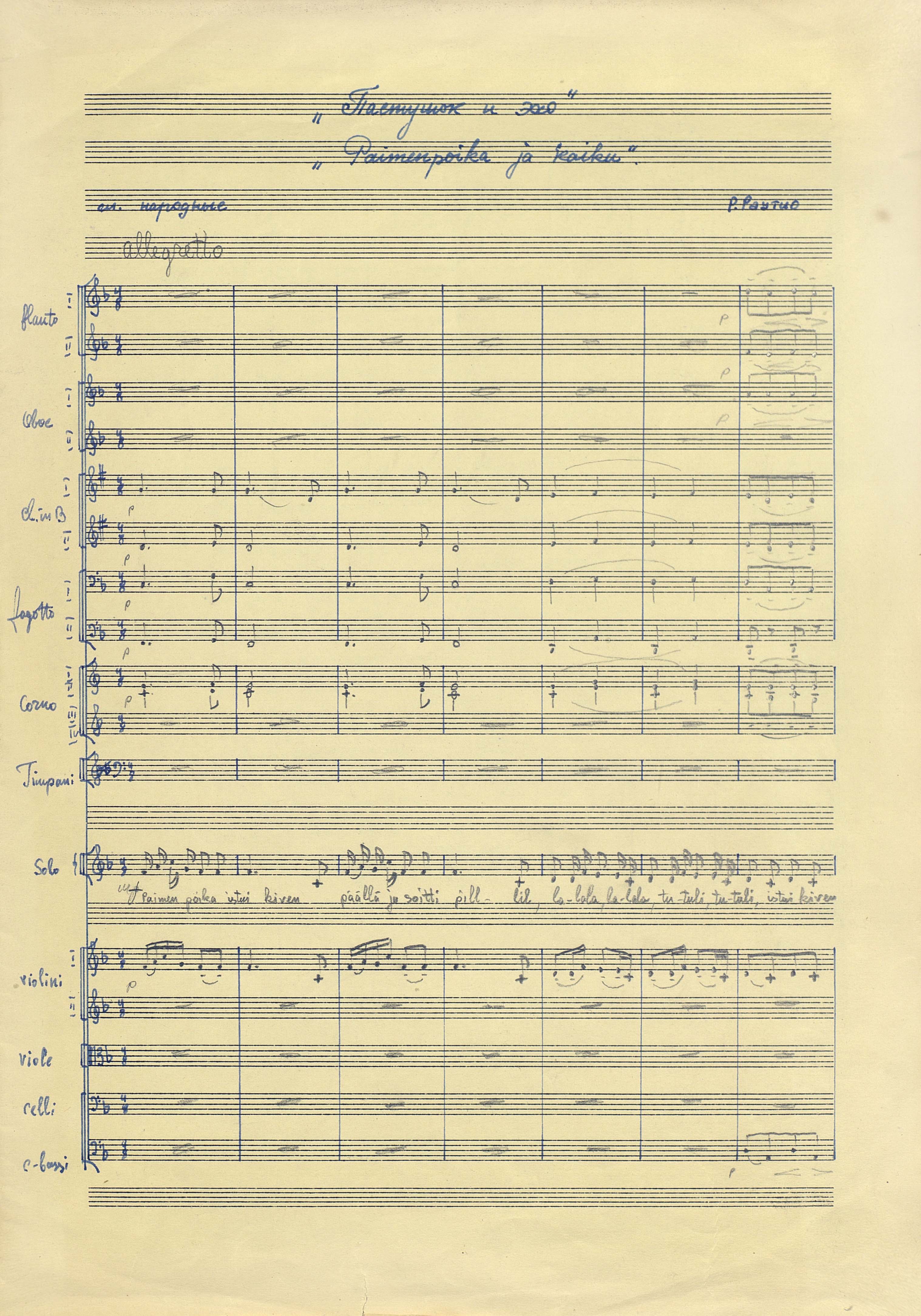 Пастушок и эхо [Ноты : рукопись] : "Paimenpoika istui kiren..." : [для голоса и ансамбля (оркестра)] / Р. Раутио ; сл. народные. - Партитура. - [до 1960]. - 5 л. (8 с.) ; 37 см, в картонной папке. - Коллекция нотных рукописей карельских композиторов и музыкантов. Опись № 1, дело № 672. - Влож. текст песни на рус. яз., обр. Р. Такала