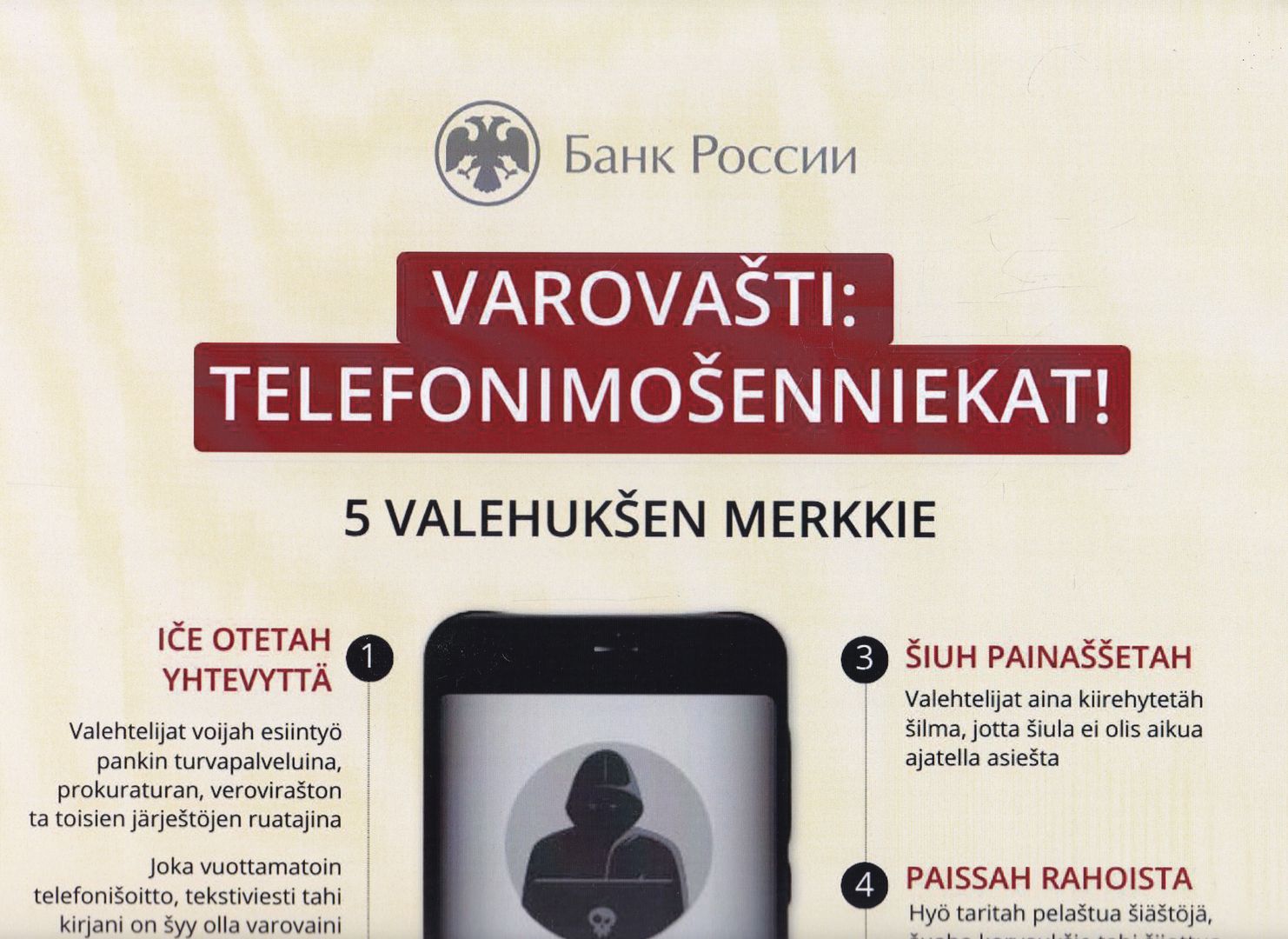 V 29 Varovasti: telefonimosenniekat! : [плакат] / Банк России. - [Москва : Банк России, 2025]. - 1 л. : цв. офсет ; 42х30 см. - Текст на карельском языке (собственно-карельское наречие). - Плакат содержит QR-код со ссылками на аудиозаписи к настоящему изданию. - Изображение(двухмерное; неподвижное). Текст : непосредственные