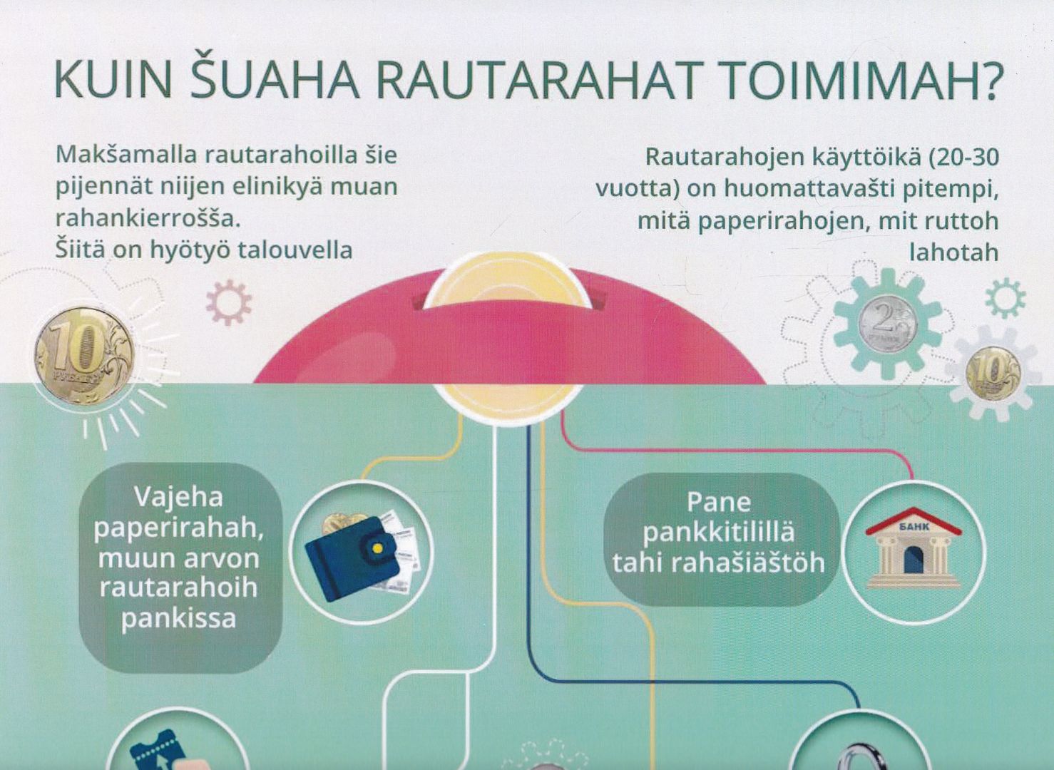 K 90 Kuin suaha rautarahat toimimah? : [плакат] / Банк России. - [Москва : Банк России, 2025]. - 1 л. : цв. офсет ; 42х30 см. - Текст на карельском языке (собственно-карельское наречие). - Изображение(двухмерное; неподвижное). Текст : непосредственные