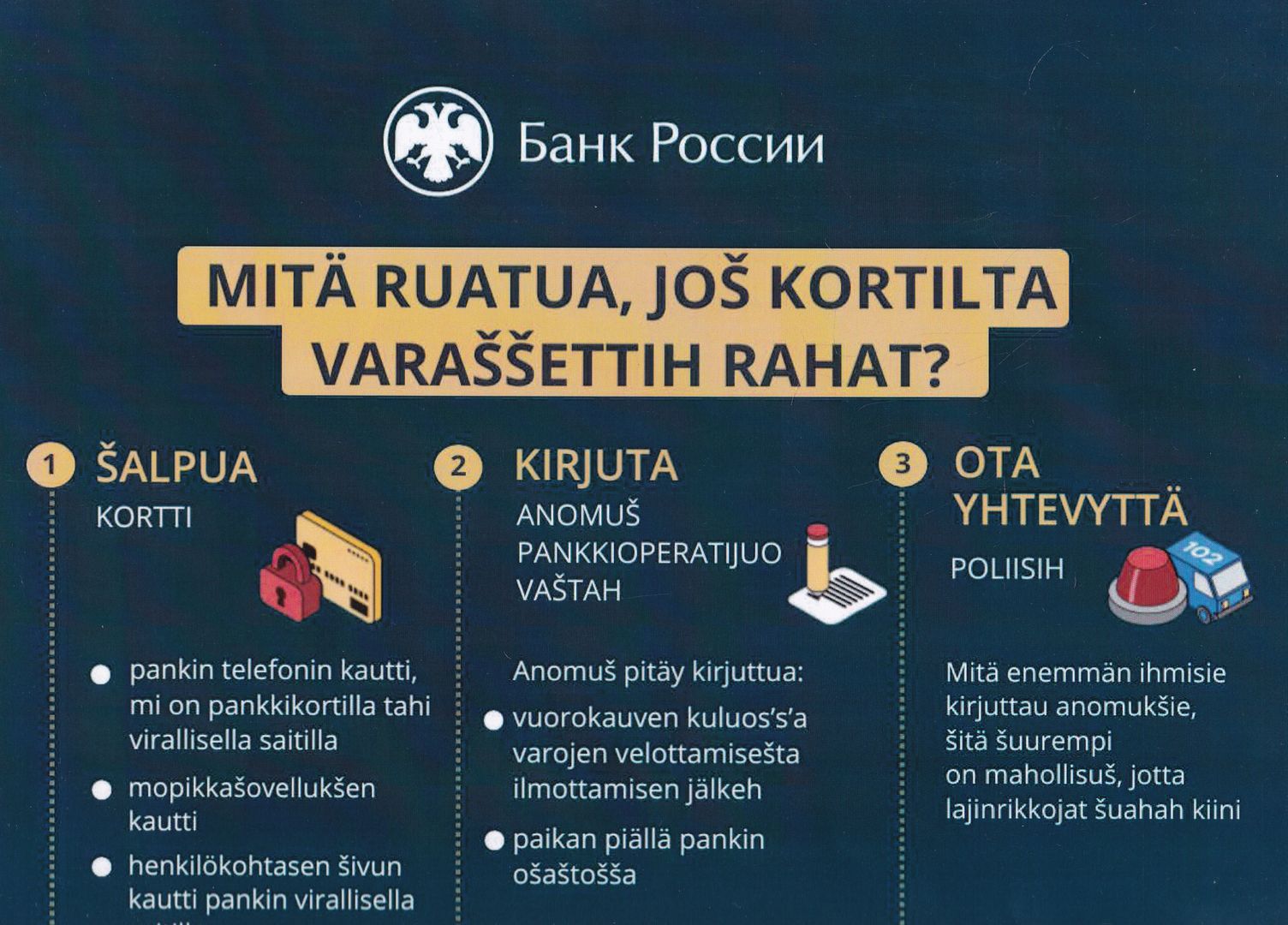 M 76 Mita ruatua, jos kortilta varassettih rahat? : [плакат] / Банк России. - [Москва : Банк России, 2025]. - 1 л. : цв. офсет ; 42х30 см. - Текст на карельском языке (собственно-карельское наречие). - Плакат содержит QR-код со ссылками на аудиозаписи к настоящему изданию. - Изображение(двухмерное; неподвижное). Текст : непосредственные