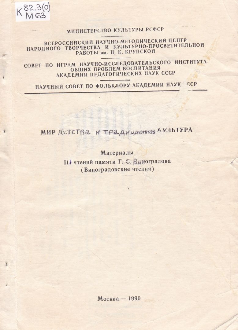М 63     Мир детства и традиционная культура : материалы III Чтений памяти Г. С. Виноградова (Виноградовские чтения) / составители В. М. Григорьев, М. А. Мухлынин. - Москва : Всероссийский научно-методический центр народного творчества и культурно-просветительной работы им. Н. К. Крупской, 1990. - 176 с. ; 20 см. - В надзаголовочных данных: Министерство культуры РСФСР, Всероссийский научно-методический центр народного творчества и культурно-просветительной работы им. Н. К. Крупской, Совет по играм Научно-исследовательского института общих проблем воспитания Академии педагогических наук СССР, Научный совет по фольклору Академии наук СССР. - Текст : непосредственный