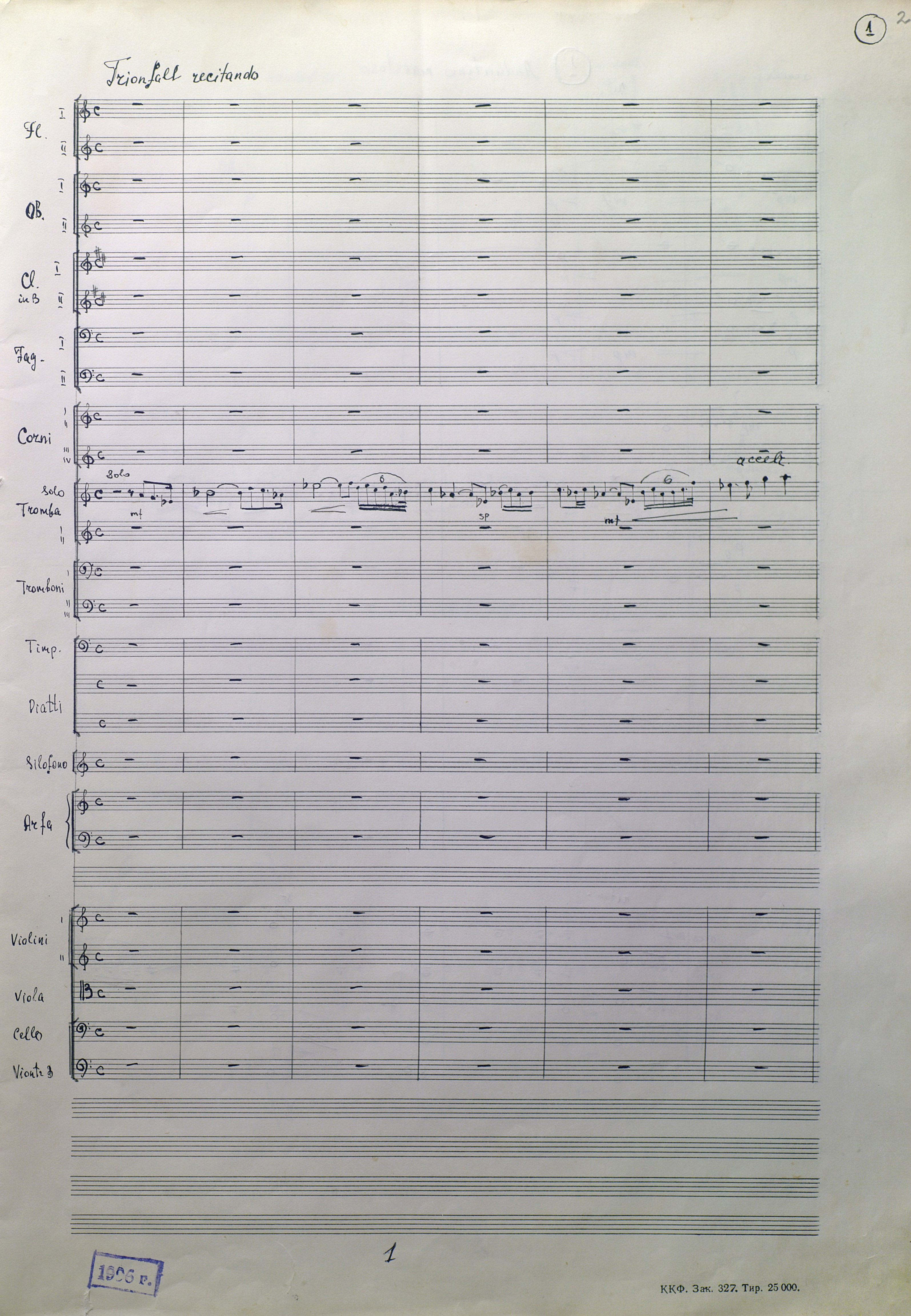 | РН 568 П А 729 Антышев, А. А. (1931 - 2001). Концертино [Ноты : рукопись] : для трубы in B с симфоническим оркестром / А. Антышев. - Партитура. - Медвежьегорск, 1986. - 25 л. (47 с.) ; 40 см, в картон. папке. - Коллекция нотных рукописей карельских композиторов и музыкантов. Опись № 1, дело № 553 Рукописные ноты. Фондодержатель: Национальная библиотека Республики Карелия