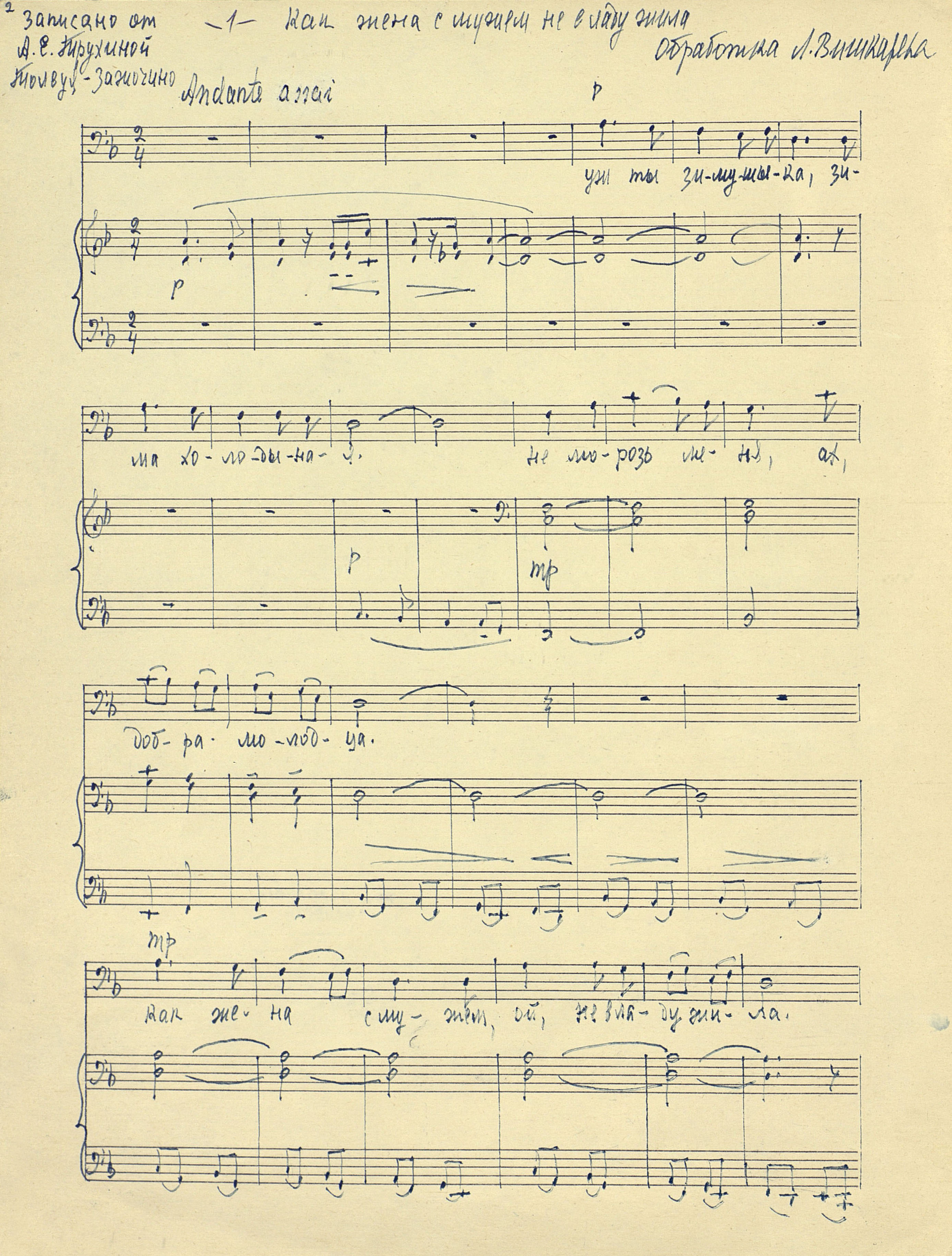 | РН 1914923 В 553 Вишкарев, Л. В. (1907 - 2001). Как жена с мужем не в ладу жила [Ноты : рукопись] : народная баллада : свободная обработка для баса с фортепиано / Л. Вишкарев. - 1969. - 4 с. ; 32 см, в картонной папке. - Коллекция нотных рукописей карельских композиторов и музыкантов. Опись № 1, дело № 1177. - Записано от А. С. Трухиной (Толвуя - Зажочино) Рукописные ноты. Фондодержатель: Национальная библиотека Республики Карелия