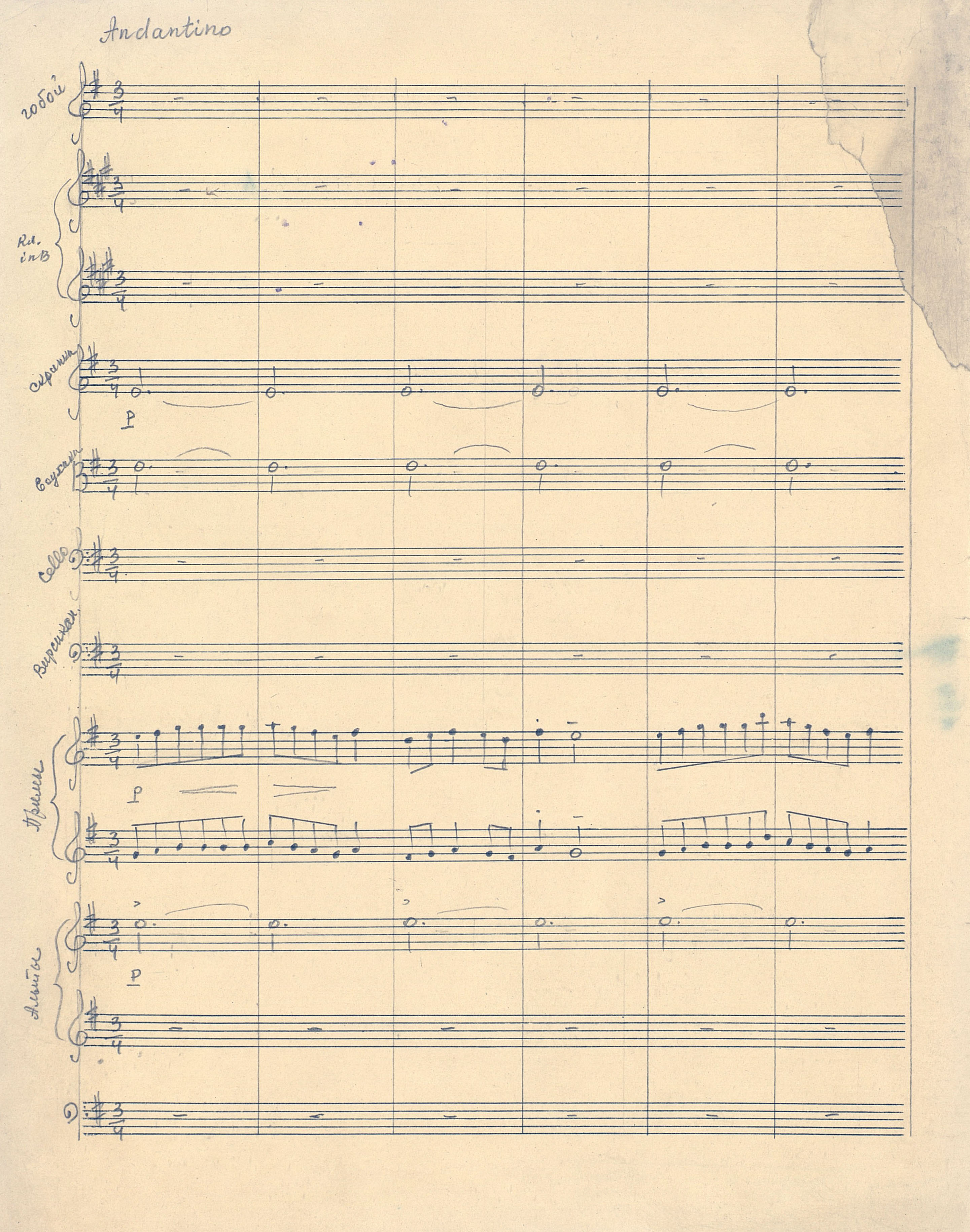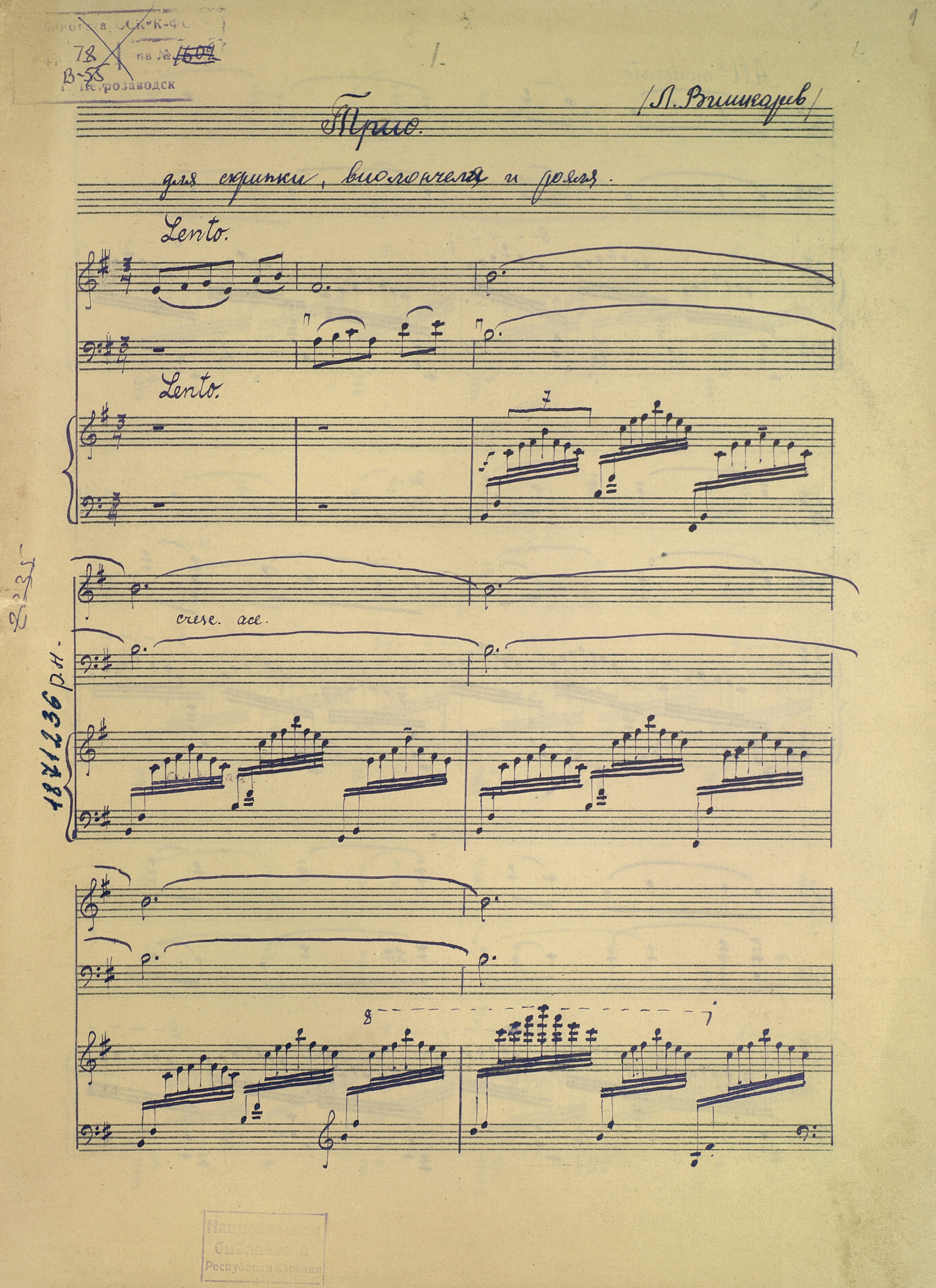 | РН 1871235ПГ В 553 Вишкарев, Л. В. (1907 - 2001). Трио для скрипки, виолончели и рояля [Ноты : рукопись] / Л. Вишкарев. - Партитура и голоса. - [19--]. - 39 л. (3 тетр. (20, 20, 12 с.), 2 парт. (12, 14 с.) ; 33 см ; в картон. папке, 34 см. - Коллекция нотных рукописей карельских композиторов и музыкантов. Опись № 1, дело № 697 Рукописные ноты. Фондодержатель: Национальная библиотека Республики Карелия