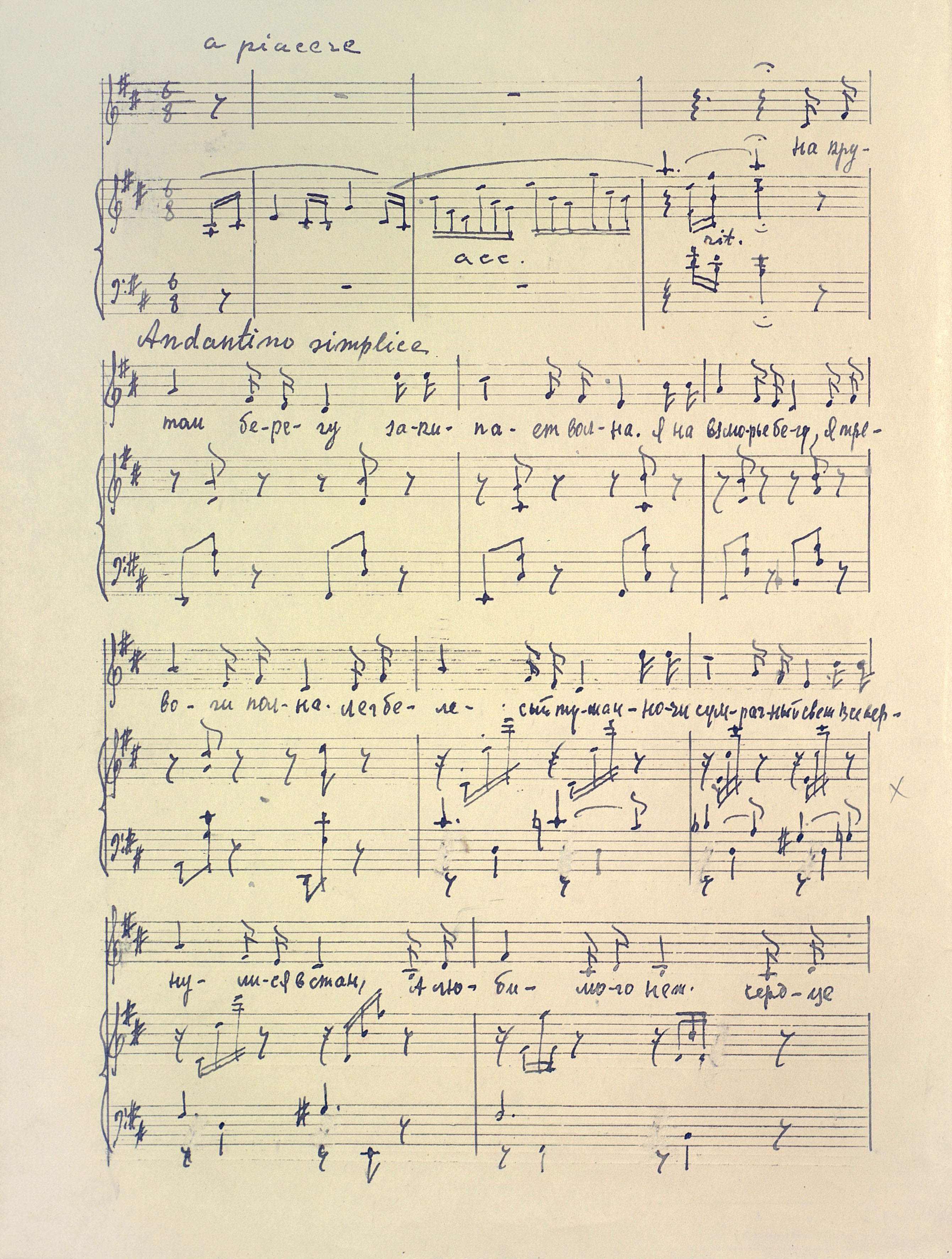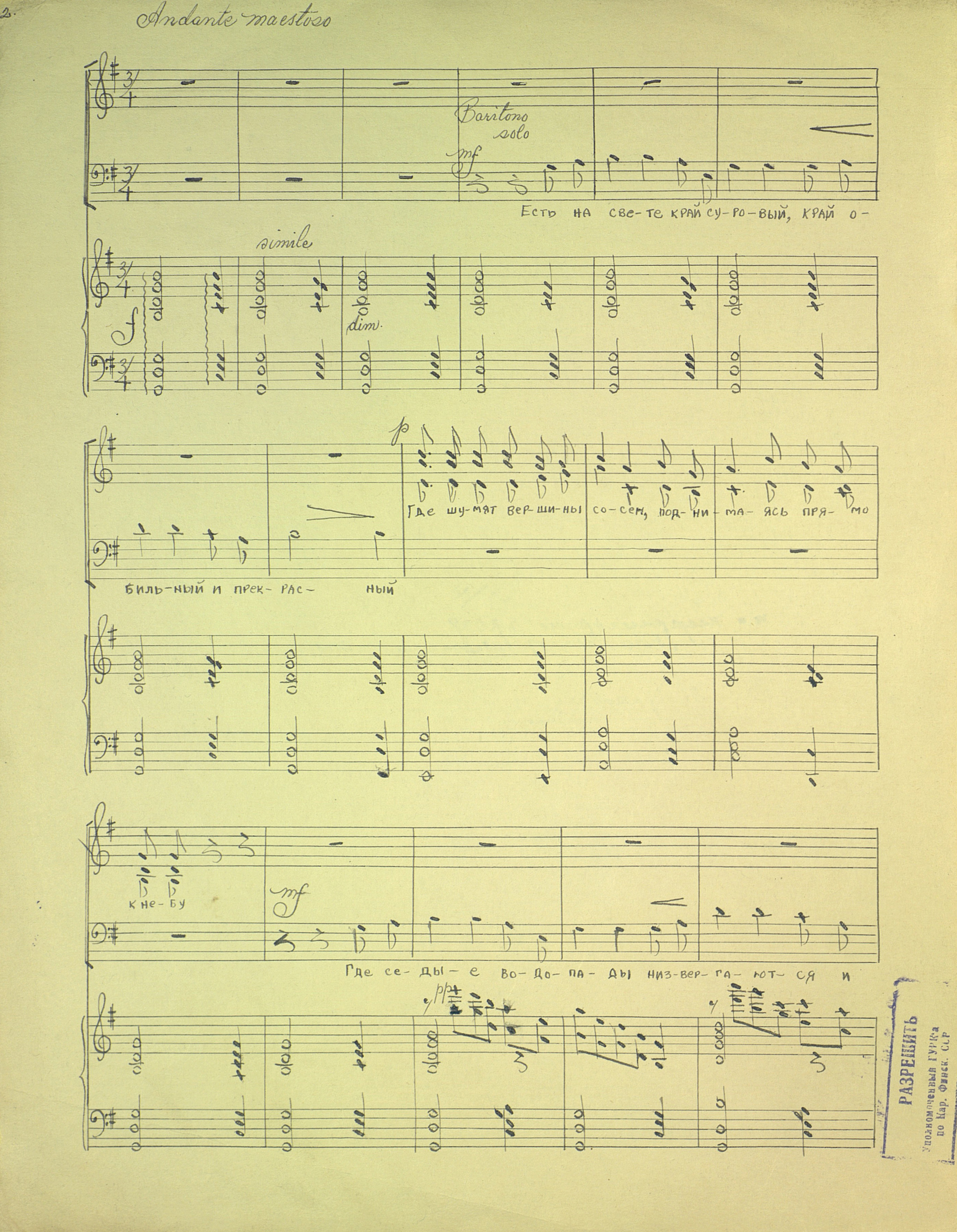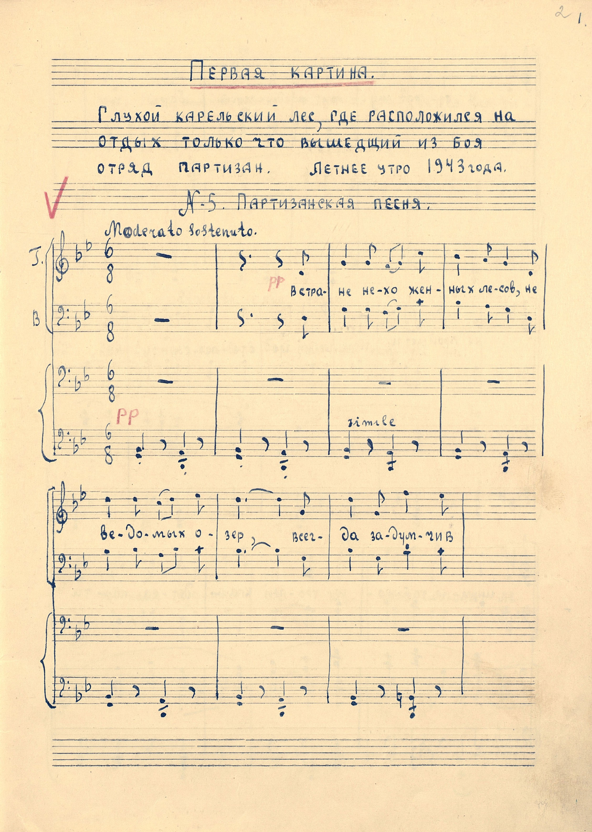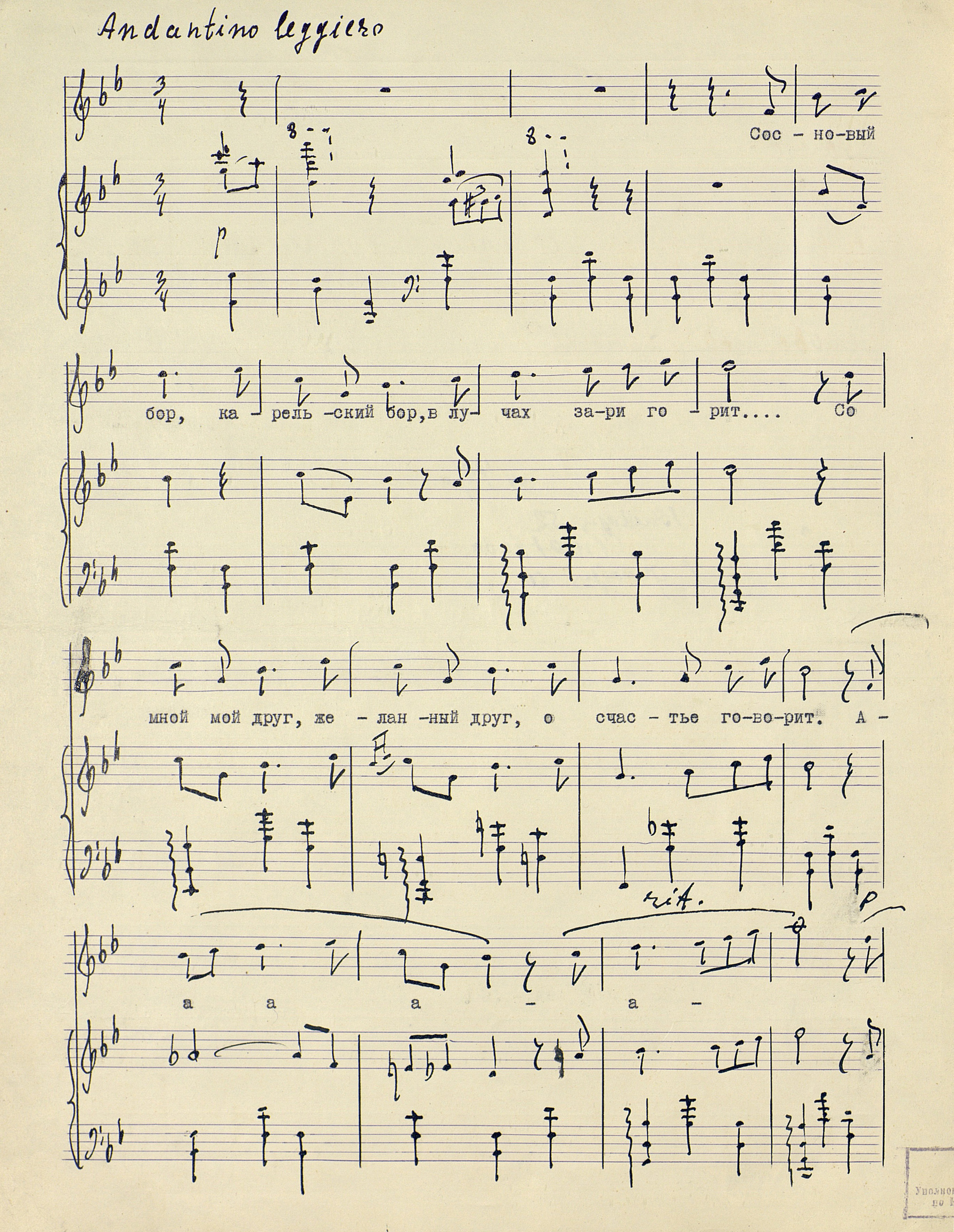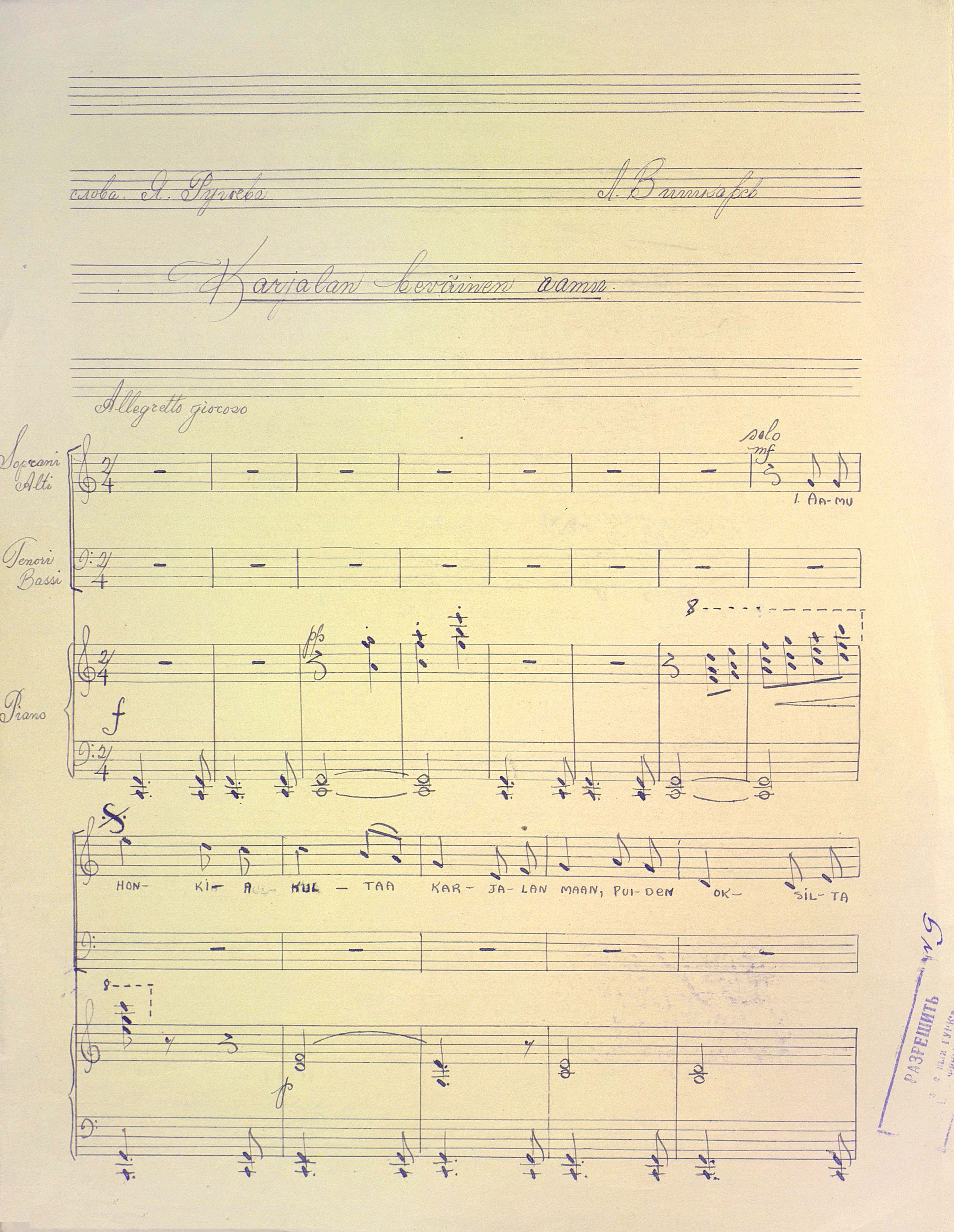 | РН 1871237 В 553 Вишкарев, Л. В. (1907 - 2001). Весеннее утро Карелии [Ноты : рукопись] : "Утро золотит сосны..." : "Aamu kulta honkia..." : [для смешанного хора и фортепиано] / Л. Вишкарев ; сл. Я. Ругоева. - [1949]. - 4 л. (3 с.) ; 31 см ; в картон. папке. - Коллекция нотных рукописей карельских композиторов и музыкантов. Опись № 1, дело № 699. - На рус. и фин. яз. Рукописные ноты. Фондодержатель: Национальная библиотека Республики Карелия