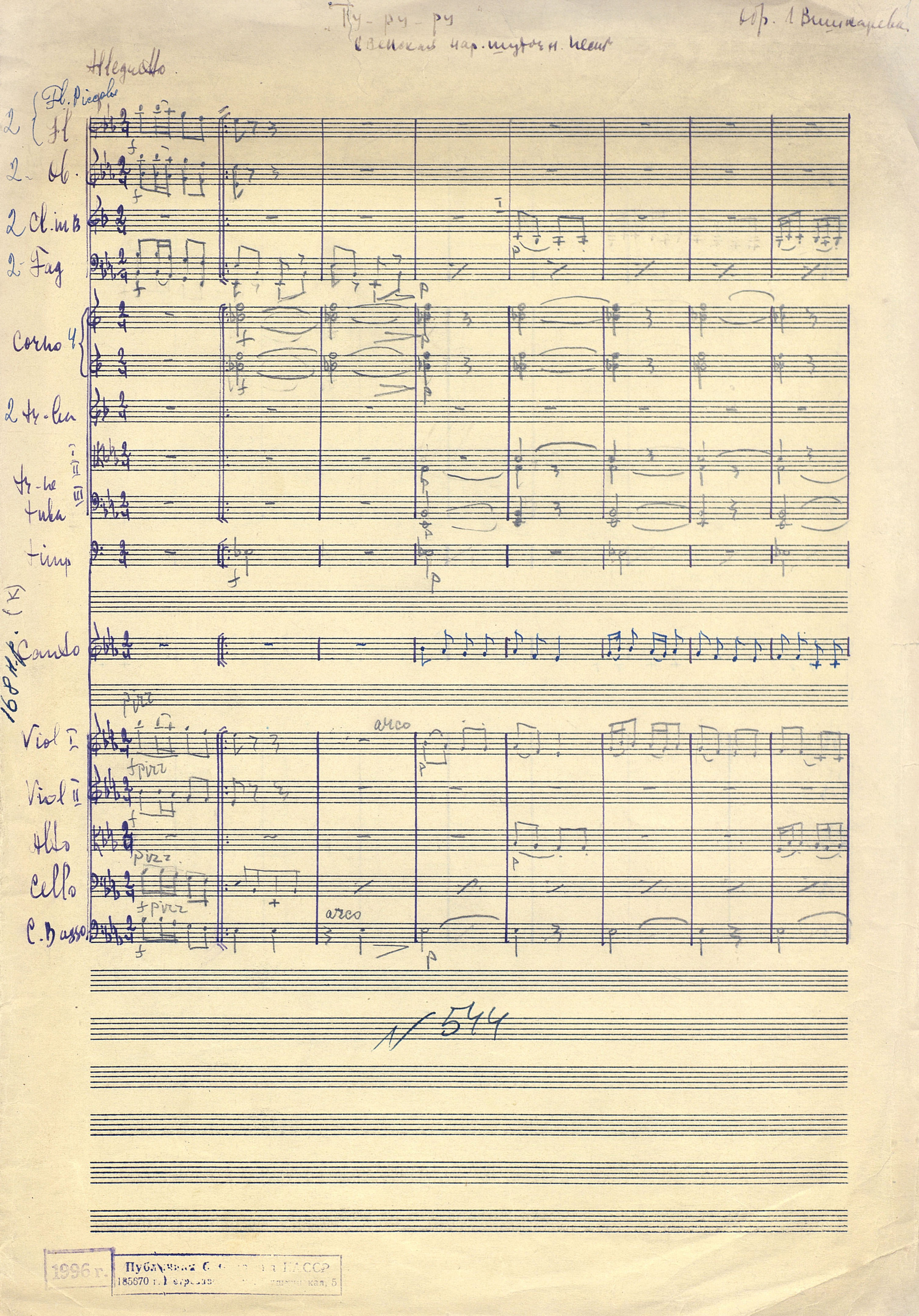 | РН 1871190 П В 553 Вишкарев, Л. В. (1907 - 2001). Священная война [Ноты] : "Грома гремят над перелеском..." : кантата для сопрано, тенора, баритона, баса, смешанного хора и малого сифмонического оркестра / Леонид Вишкарев ; текст К. Ананченко, И. Бойкова, М. Исаковского, В. Лебедева-Кумача. - Партитура. - [19--]. - 17 л. (29 с.). - Коллекция нотных рукописей карельских композиторов и музыкантов. Опись № 1, дело № 652 Рукописные ноты. Фондодержатель: Национальная библиотека Республики Карелия
