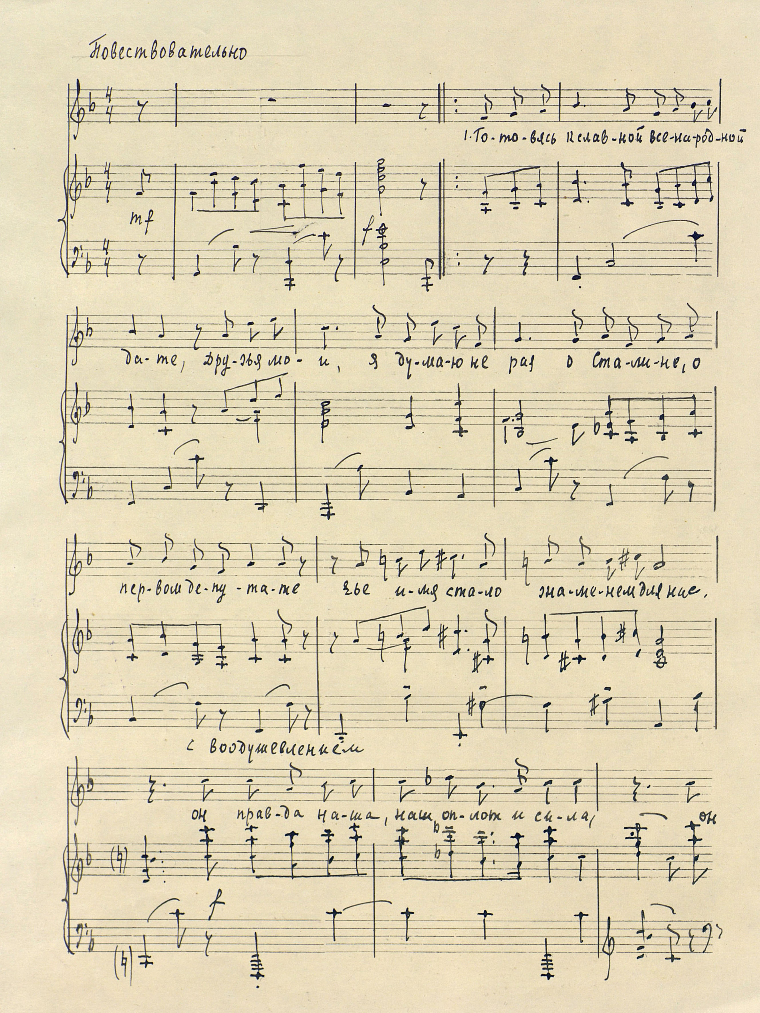 | РН 166 Фп В 553 Вишкарев, Л. В. (1907 - 2001). Дочь народа [Ноты : рукопись] : опера, № 1, Пролог / Л. Вишкарев ; либр. В. Рождественского. - Клавир. - [до 1996]. - 20 л., (37 с.) ; 30 см, в картон. папке. - Коллекция нотных рукописей карельских композиторов и музыкантов. Опись № 1, дело 153 Рукописные ноты. Фондодержатель: Национальная библиотека Республики Карелия