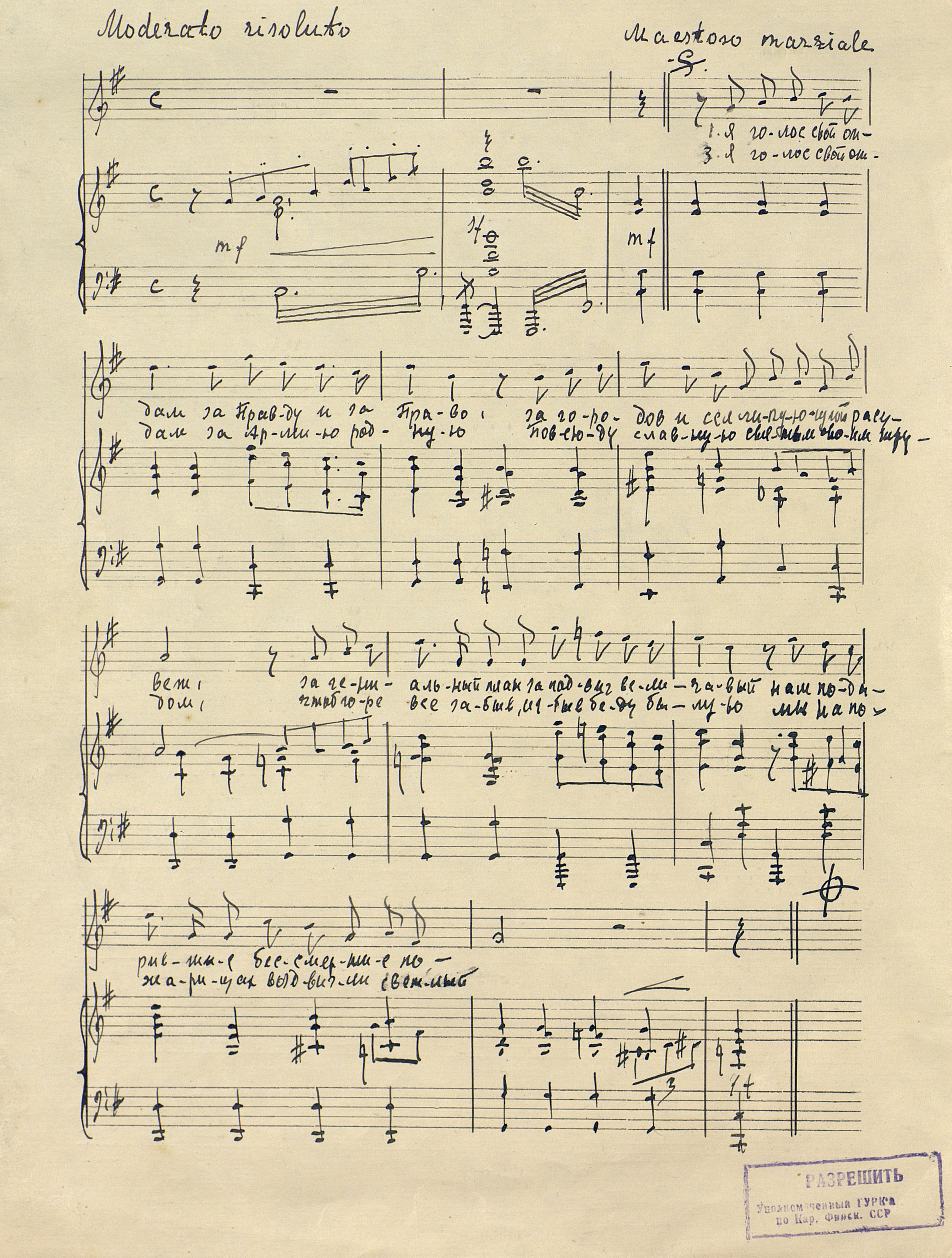 | РН 353 В 553 Вишкарев, Л. В. (1907 - 2001). Я голос свой отдам [Ноты : рукопись] : [песня для голоса и фортепиано] / Л. Вишкарев ; сл. М. Рыльского. - [1950]. - 2 л. (3 с.) ; 30 см, в картон. папке. - Коллекция нотных рукописей карельских композиторов и музыкантов. Опись № 1, дело № 340 Рукописные ноты. Фондодержатель: Национальная библиотека Республики Карелия