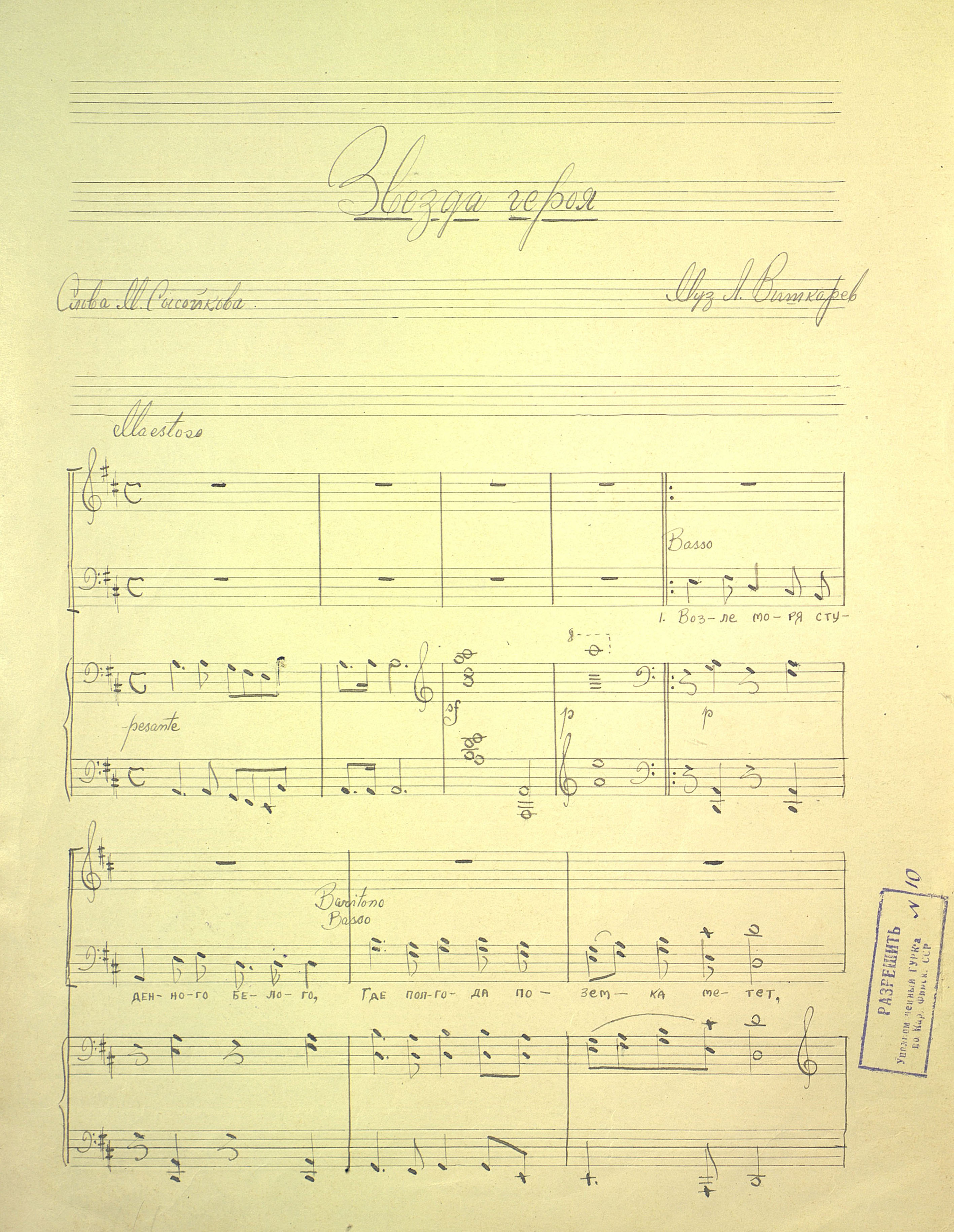 | РН 1871192 В 553 Вишкарев, Л. В. (1907 - 2001). Звезда героя [Ноты] : "Возле моря студеного, Белого..." : [для хора и фортепиано] / Л. Вишкарев ; сл. М. Сысойкова. - [1949]. - 2 л. (3 с.) ; 31 см, в картон. папке. - Коллекция нотных рукописей карельских композиторов и музыкантов. Опись № 1, дело № 654. - На тит. л. и 3 с. штамп: Управление по делам искусств при Совете Министров К-ФССР, разрешается к исполнению на территории КФССР сроком по 1 янв. 1951 г., подпись, 31 декабря 1949 г. Рукописные ноты. Фондодержатель: Национальная библиотека Республики Карелия