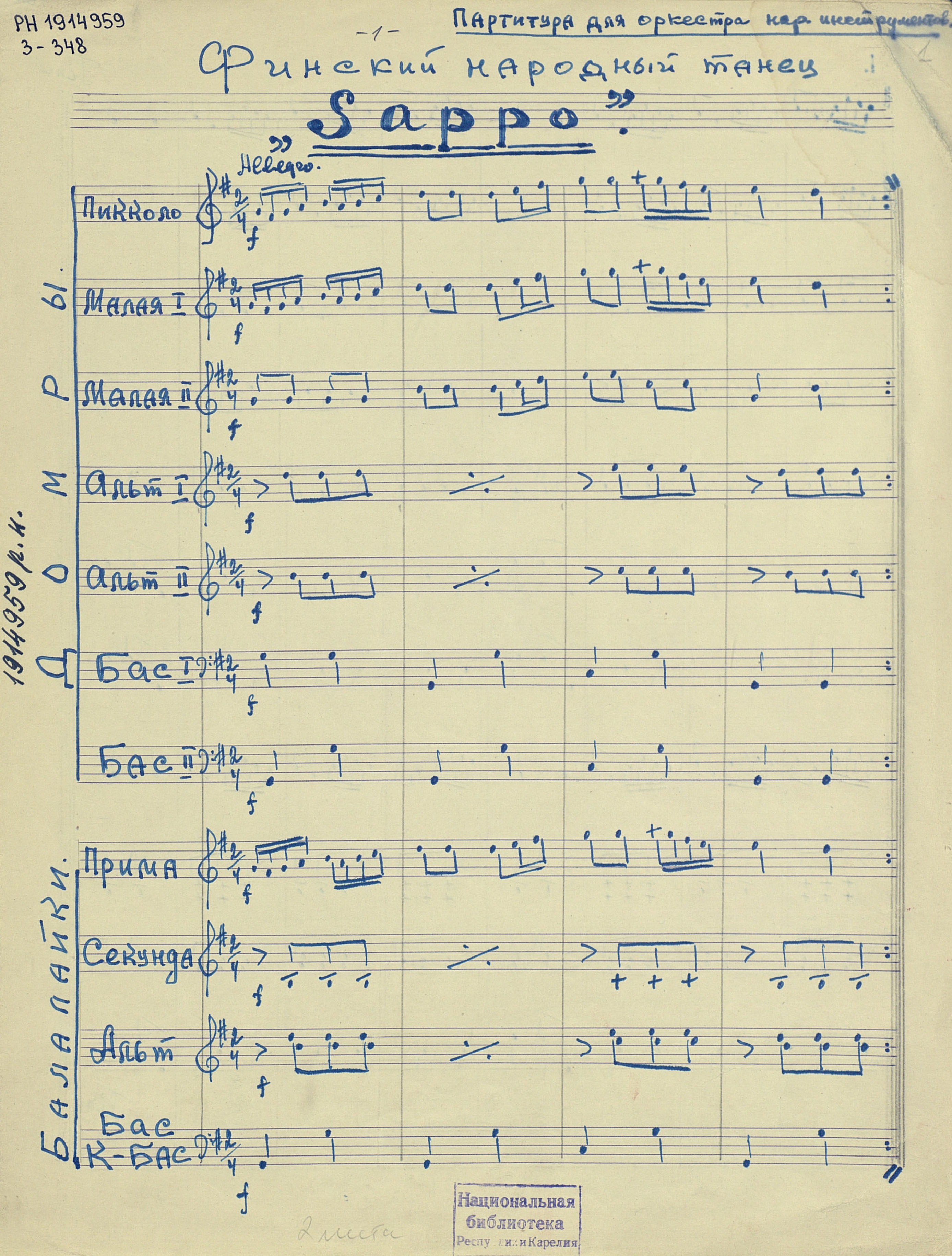 | РН 1914959 Ф 607 Sappo [Ноты : рукопись] : финский народный танец / [обраб. Ю. Зарицкого]. - Партитура для орк. нар. инструм. - [19--]. - 4 с. ; 31 см, в картон. папке. - Коллекция нотных рукописей карельских композиторов и музыкантов. Опись № 1, дело № 1213 Рукописные ноты. Фондодержатель: Национальная библиотека Республики Карелия <РУСМАРК> |