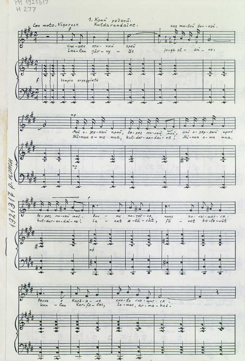 | РН 1921317 Н 277 Напреев, Б. Д. (р. 1938). Край родной [Ноты : рукопись] : кантата для детского хора с фортепиано : в 7 частях : ор. 72 / Б. Напреев ; текст на карел. яз. Ольги Мишиной ; пер. на рус. яз. Олега Мишина. - Партитура. - Петрозаводск, 1997-1998. - 13 л. (26 с.) ; 30 см ; в картон. папке. - Текст на карел. и рус. яз. - Коллекция нотных рукописей карельских композиторов и музыкантов. Опись № 1, дело № 1282 Рукописные ноты. Фондодержатель: Национальная библиотека Республики Карелия <РУСМАРК> |
