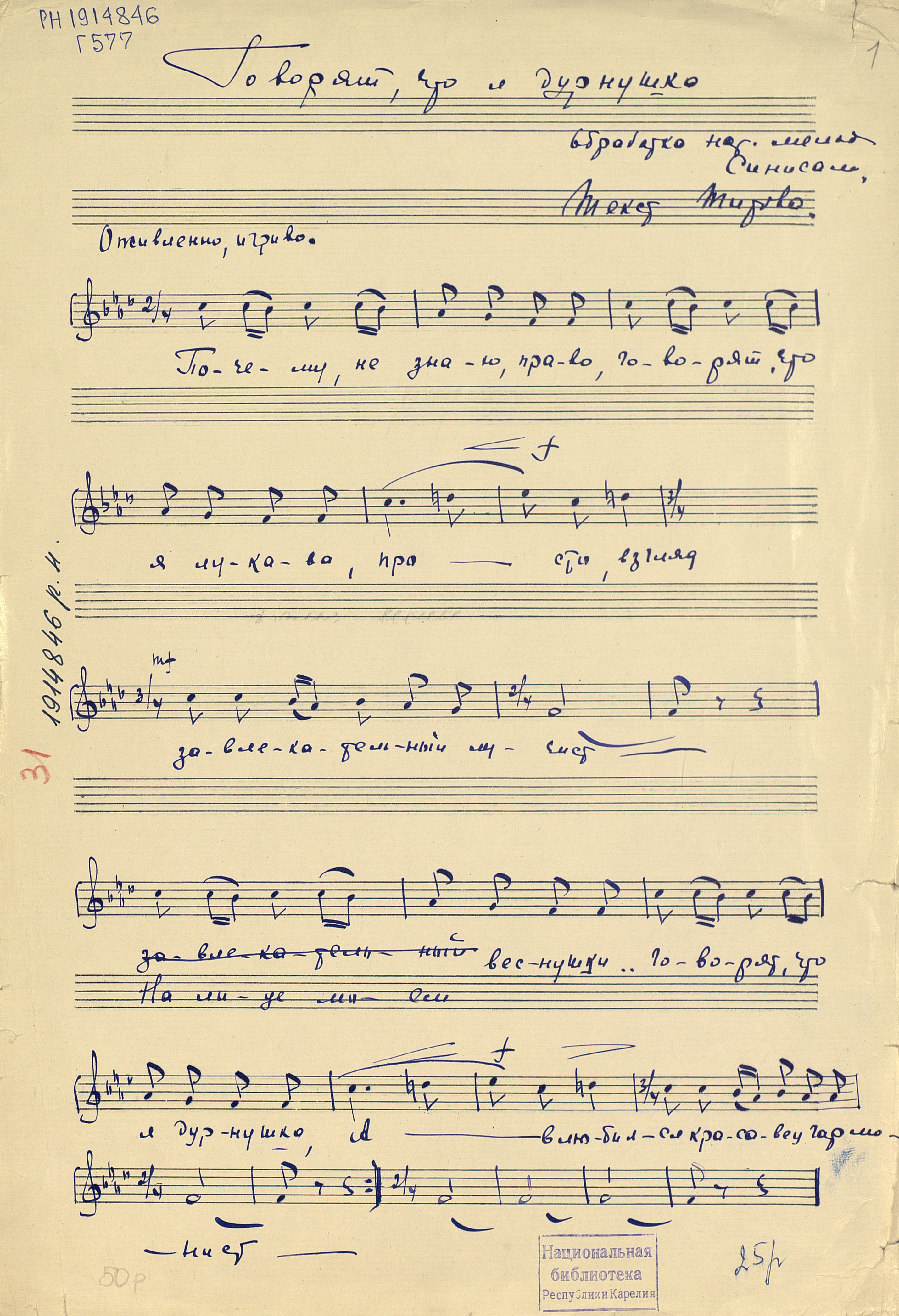 | РН 1914846 С 384 Синисало, Г.-Р. Н. (1920 - 1989). Говорят, что я дурнушка [Ноты : рукопись] / обраб. нар. мелодии Синисало Г. Н. ; текст [А.] Титова. - [19--]. - 1 л. (1 с.) ; 31 см, в картонной папке. - Коллекция нотных рукописей карельских композиторов и музыкантов. Опись № 1, дело № 1100 Рукописные ноты. Фондодержатель: Национальная библиотека Республики Карелия <РУСМАРК> |