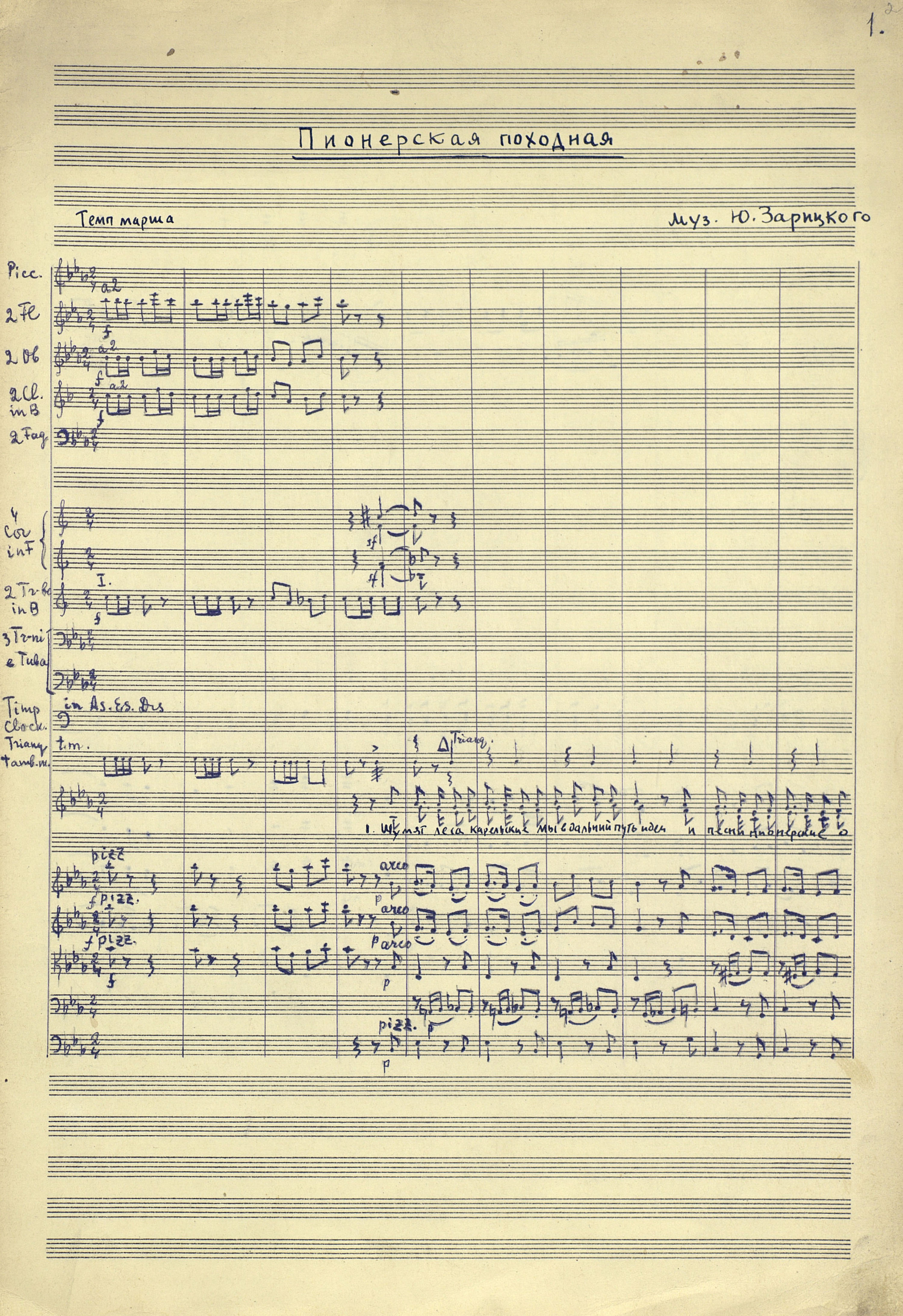 | РН 301 ПГ З-348 Зарицкий, Ю. М. (1921 - 1975). Пионерская походная [Ноты : рукопись] : песня для детского хора / Ю. Зарицкий ; инструм. для симф. орк. С. Трубачева. - Партитура и голоса. - [до 1975]. - 61 л. (1 тетр. (13 с.), 31 парт.) ; 38 см, в картон. папке. - Коллекция нотных рукописей карельских композиторов и музыкантов. Опись № 1, дело № 288 Рукописные ноты. Фондодержатель: Национальная библиотека Республики Карелия <РУСМАРК> |