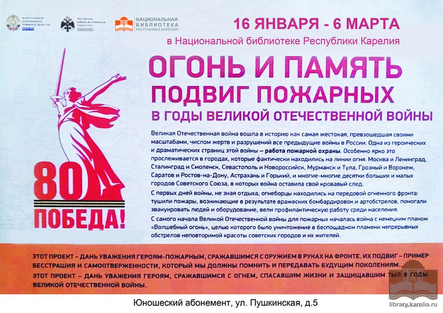 С 16 января по 6 марта на юношеском абонементе Национальной библиотеки Карелии работает выставка «Огонь и память: подвиг пожарных в годы Великой Отечественной войны». Эта выставка – дань уважения героям-пожарным, сражавшимся на фронте и спасавшим жизни в тылу.