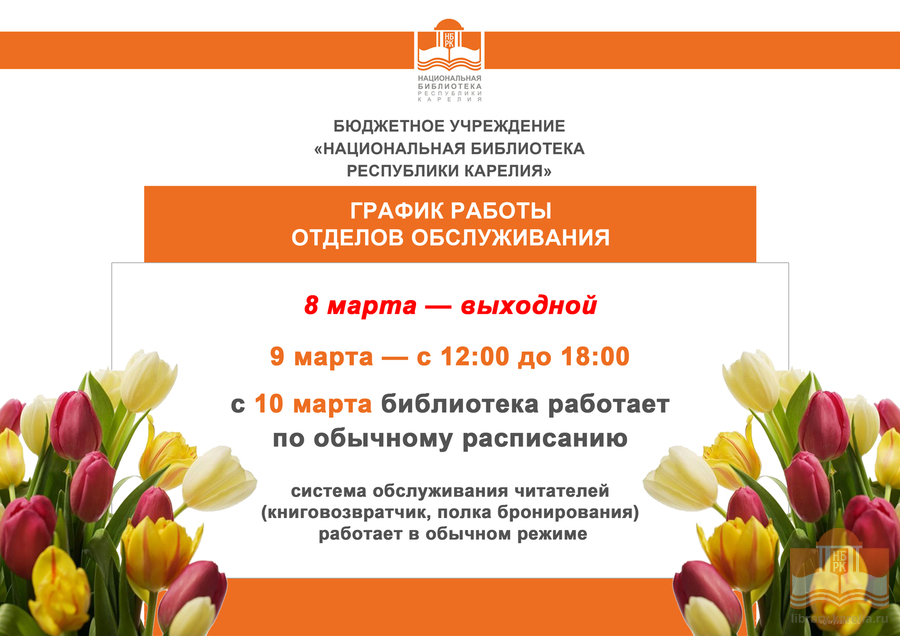 Уважаемые читатели, обратите внимание на изменения в режиме работы Национальной библиотеки Карелии в праздничные дни. 8 марта – выходной день. 9 марта – 12:00 – 18:00.