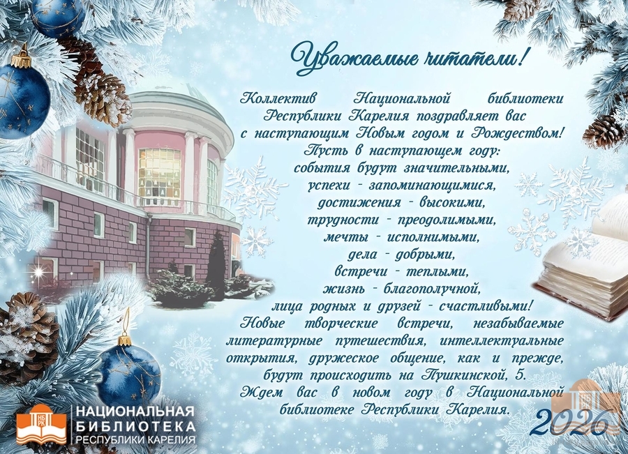 Уважаемые читатели! Коллектив Национальной библиотеки Республики Карелия поздравляет вас с наступающим Новым годом и Рождеством!