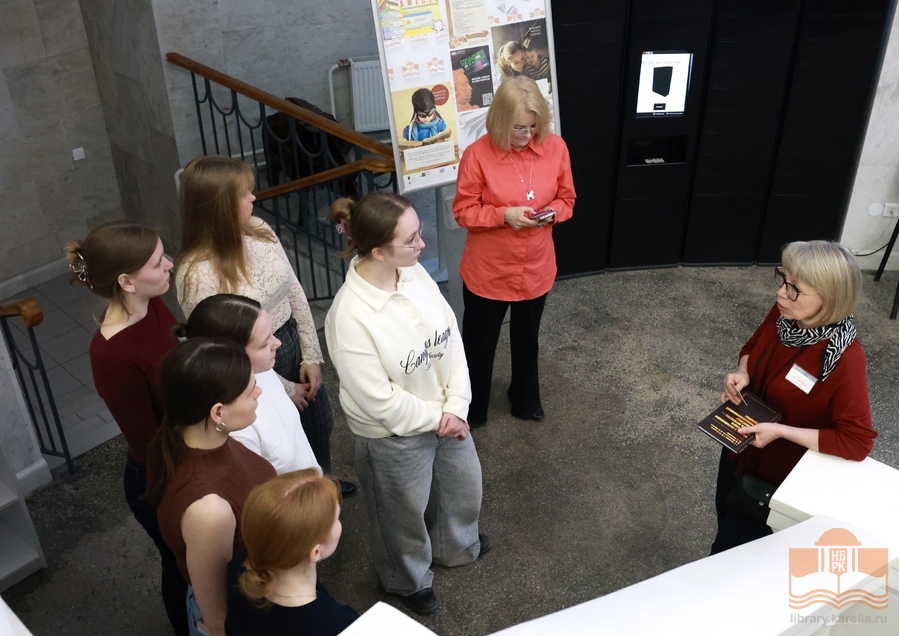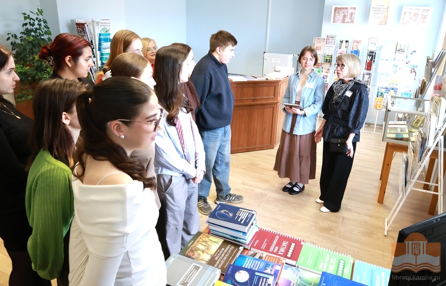 В середине апреля в Национальной библиотеке Карелии состоялся цикл встреч со студентами Медицинского института имени профессора А. П. Зильбера, будущими специалистами здоровьесберегающих профессий. Третьекурсники под руководством Ирины Анатольевны Виноградовой, профессора, заведующей кафедрой фармакологии, организации и экономики фармации, посетили отраслевые кафедры и ознакомились с фондами и библиотечными выставками. Главной точкой притяжения стала кафедра медицинской литературы с новинками печатного дела текущего и минувшего года, профессиональной периодикой, легендарной серией настольных изданий «Тактика врача» – верным спутником и в учёбе и ежедневной практике. Студенты с интересом изучили тематические экспозиции апреля, узнали, какие журналы могут читать их будущие пациенты. Открыли для себя традиции здорового образа жизни в стенах библиотеки, спектр мероприятий для взрослых, молодёжи, юных читателей и были приглашены посетить яркое событие апреля – Всероссийскую акцию «Библионочь‑2026» .