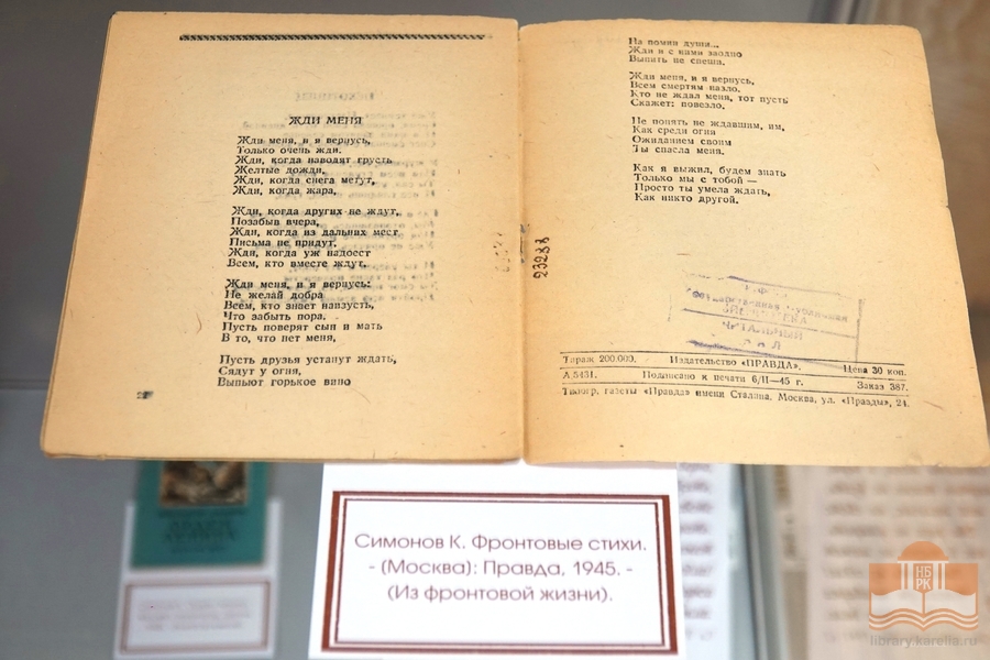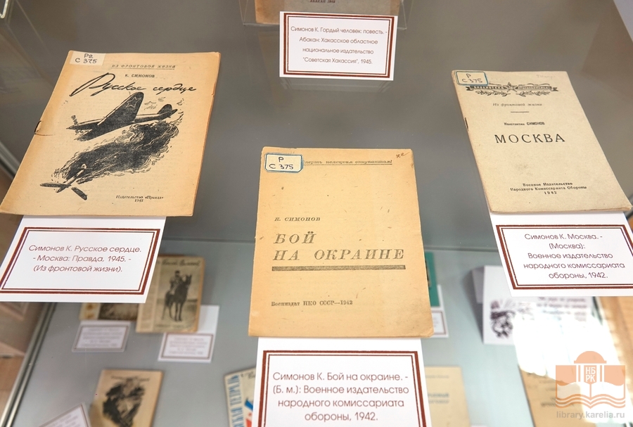 24 ноября в секторе редких книг Национальной библиотеки Карелии открылась книжная выставка, посвященная 80-летию Победы в Великой Отечественной войне и 110-летию со дня рождения советского писателя и поэта Константина Михайловича Симонова.