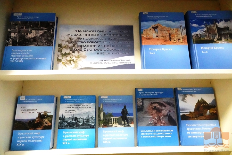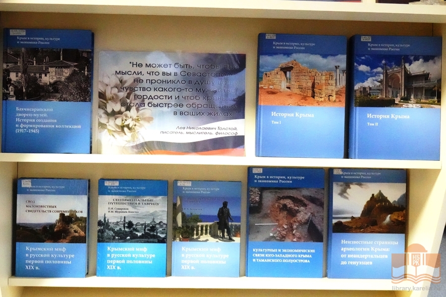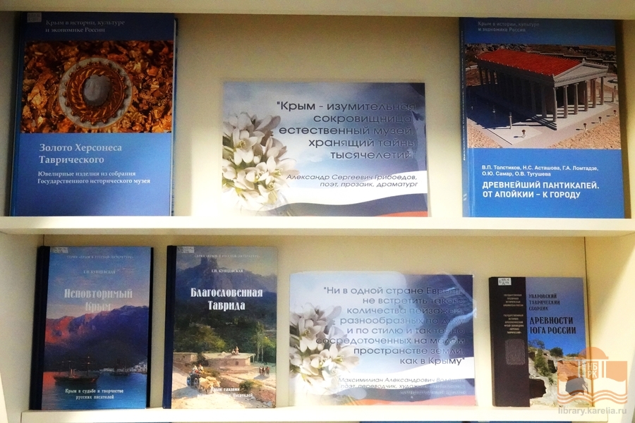 В Национальной библиотеке Карелии открылась книжная выставка «Крымская весна», приуроченная к 12-й годовщине воссоединения Крыма с Россией. У народов Крыма и России общая историческая судьба. Крым – это то место на карте нашей страны, где по-настоящему раскрылись таланты её творцов. Незабываемые виды и дух полуострова вдохновили поэтов и писателей на создание бессмертных шедевров.