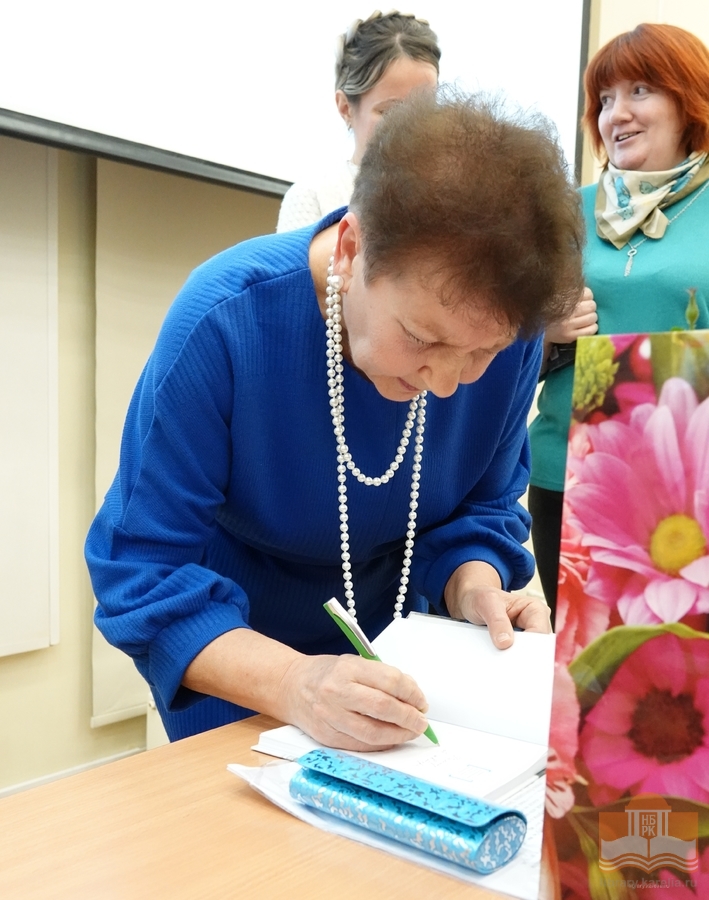 Презентация состоялась накануне Международного Дня дарения книги, и Надежда Борисовна подарила некоторые свои книги нашей библиотеке. Завершила встречу автограф-сессия: каждый желающий мог приобрести повесть «Луна на старом гобелене» в книжном киоске библиотеки с автографом автора.